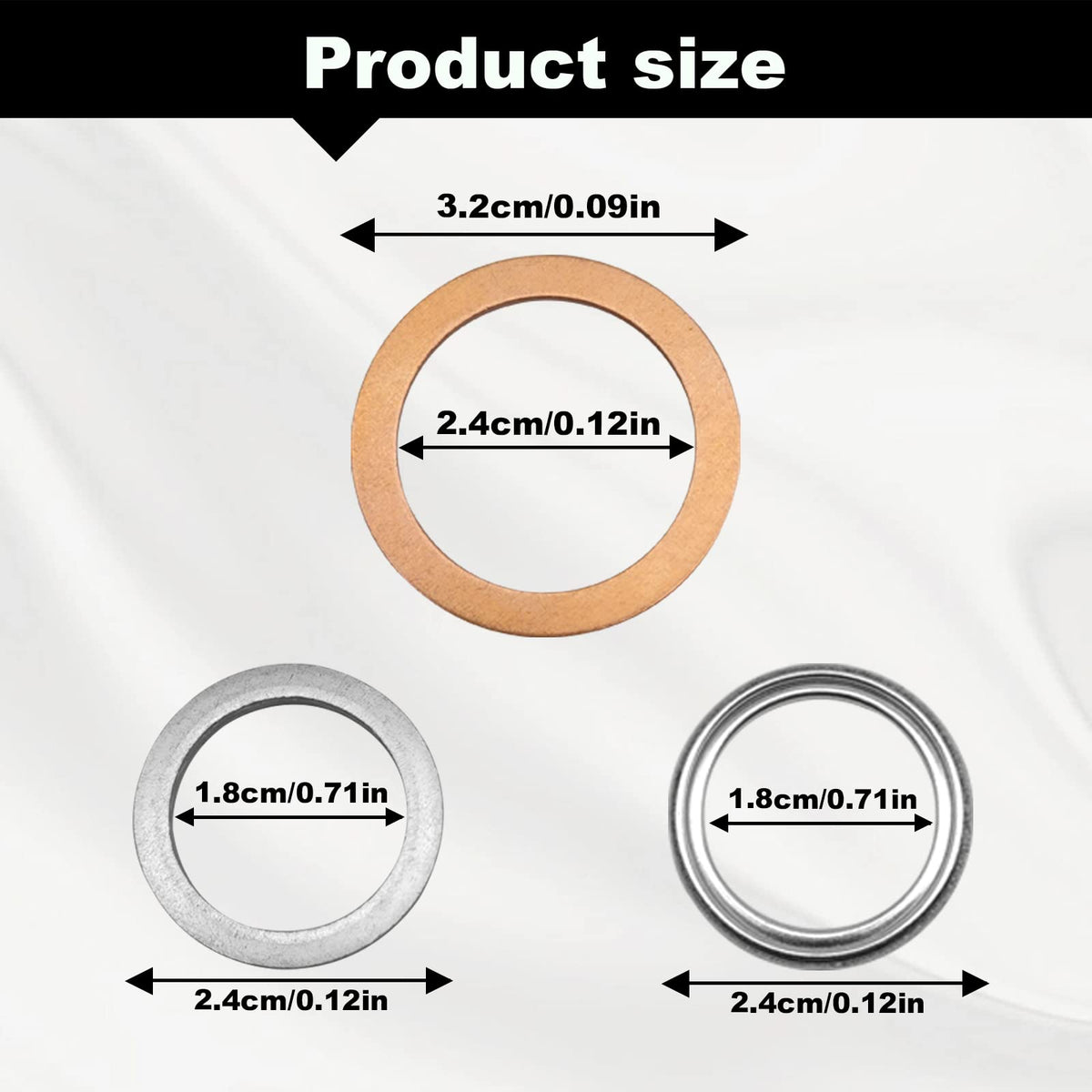 Q: What are the dimensions of the included gaskets?A: The steel gaskets have an I.D. of 18.2mm and O.D. of 24.2mm with a thickness of 2.50mm, while the copper washer has an I.D. of 24mm and O.D. of 32mm, and the aluminum washers are 18mm in size.