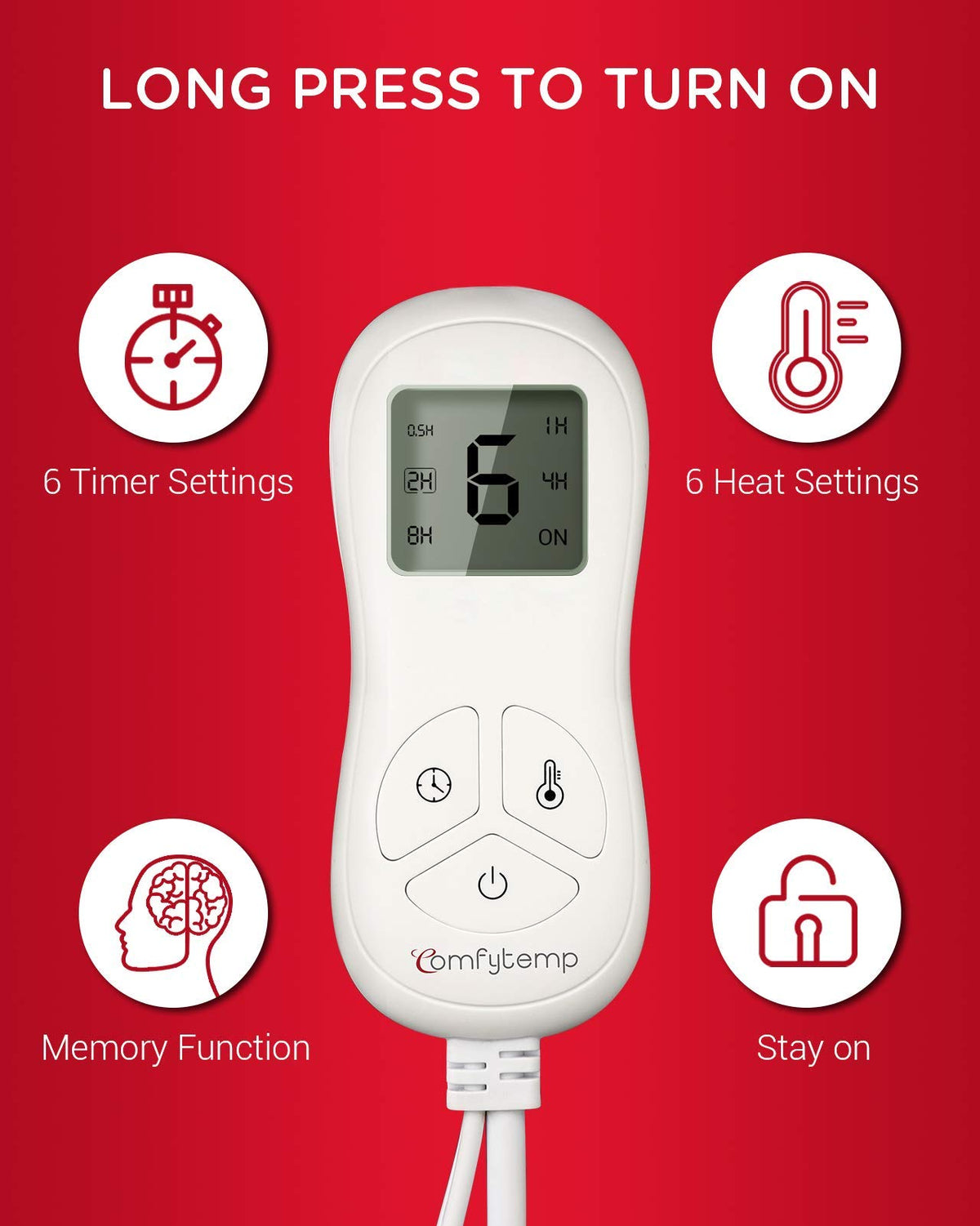 • Q: What features does the Comfytemp travel blanket offer for user convenience? A: This travel blanket includes 6 heat settings to customize your comfort level and 5 auto-off timers for safety, ensuring the blanket can be tailored to your needs.