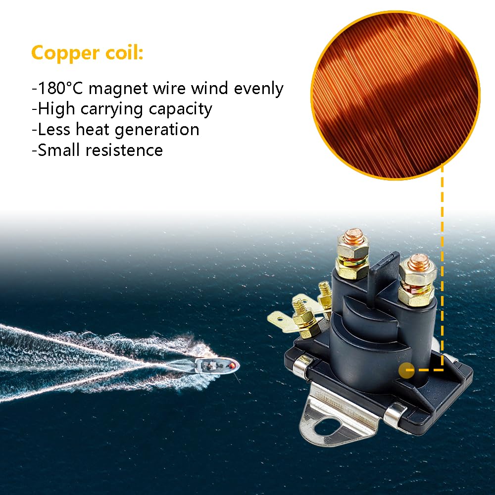 Q: What specifications should I consider when installing this solenoid?A: When installing the 12V Marine Starter Solenoid, consider its specifications: it operates at 12VDC with a work current of 80A, has a flat 180 mounting type, and features a high-performance ABS body shell.