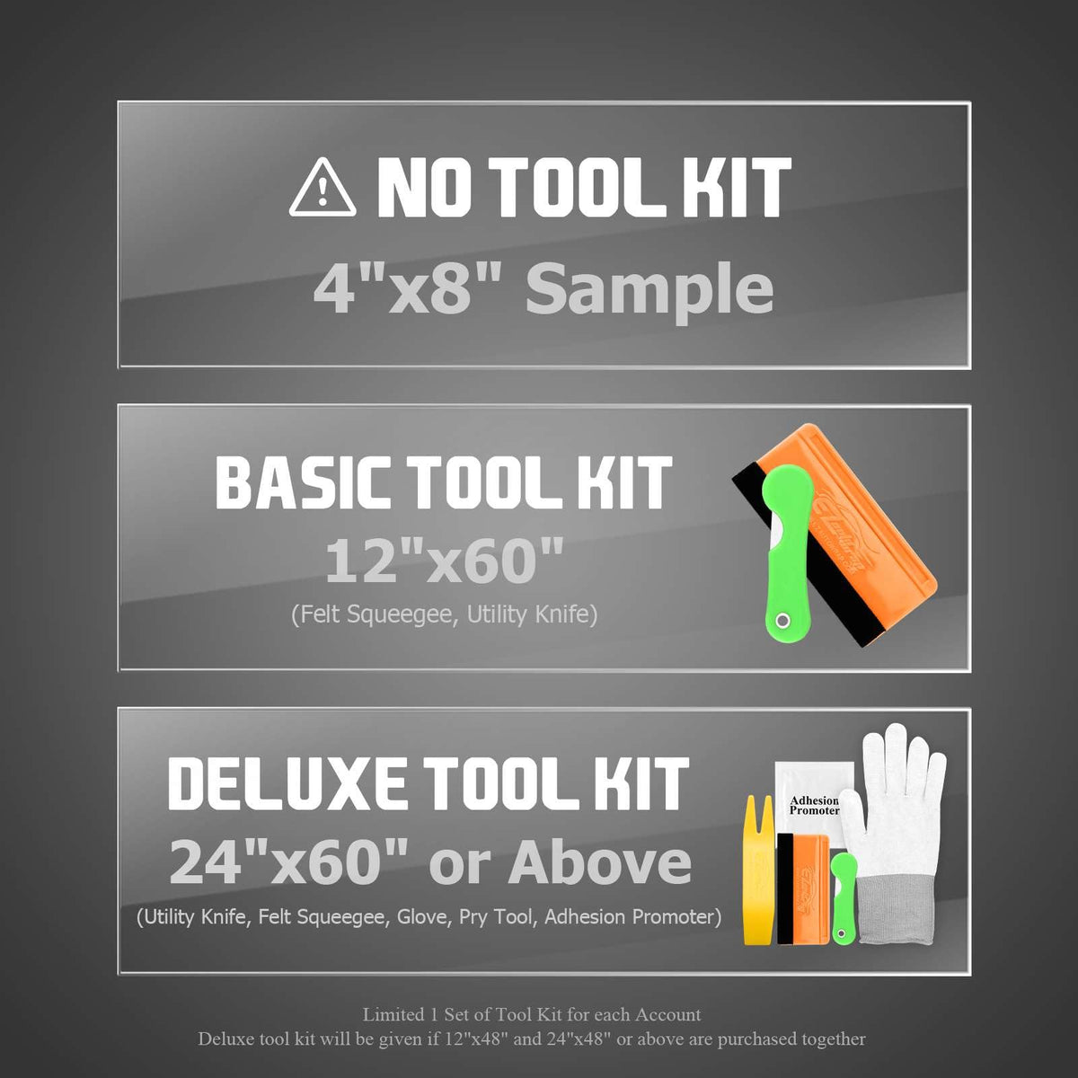 Free Tool Kit Requirement Size of 4”x8” DO NOT come with Tool Kit Size of 12x60 Include 1 set of Basic Tool Kit Size of 24x60 and above Include 1 set of Deluxe Tool Kit Limited 1 Set of Tool Kit for each Account ONLY regardless of quantity purchase