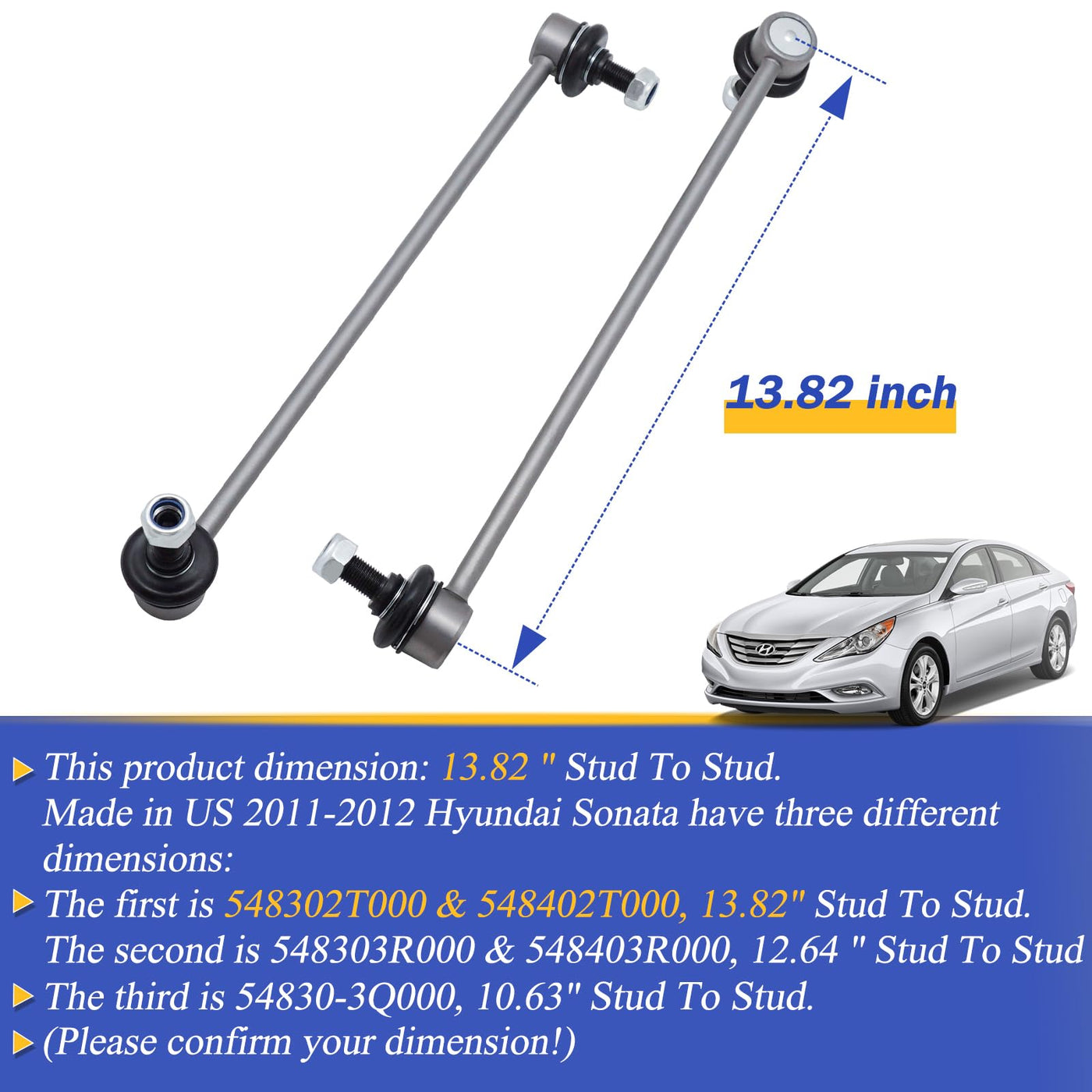 Notice: This Product Dimension: 13.82 In. Stud To Stud. Made In Us 2011-2015 Hyundai Sonata Have Two Different Dimension: Our Product Is 548302T000 548402T000, 13.82 In. Other Is 548303R000 548403R000, 12.64 In. Manufacturer Part Number: 548302T000 & 548402T000 Feature: The Parts Are Manufactured In Strict Accordance With Oem Specifications,Stable Characteristics, High Reliability.Perfect Match For The Original Car. Warranty: 12 Month Package Included: Left Stabilizer Sway Bar Links X 1 Right Stabilizer Sway Bar Links X 1 Fit For The Following Vehicles: 2012 Hyundai Sonata Hybrid Premium 13.82 In. Stud To Stud 2011-2012 Hyundai Sonata (Submodel: 2.0T, 2.0T Limited, Gl, Gls, Hybrid, Limited, Se) 13.82 In. Stud To Stud 2011 Kia Optima (Submodel: Ex, Hybrid, Lx, Sx) 13.82 In. Stud To Stud 2012 Kia Optima (Submodel: Ex, Hybrid, Lx, Sx) Usa Built Vehicle, Thru 11/11, Korean Built, Thru 12/22/11 13.82 In. Stud To Stud