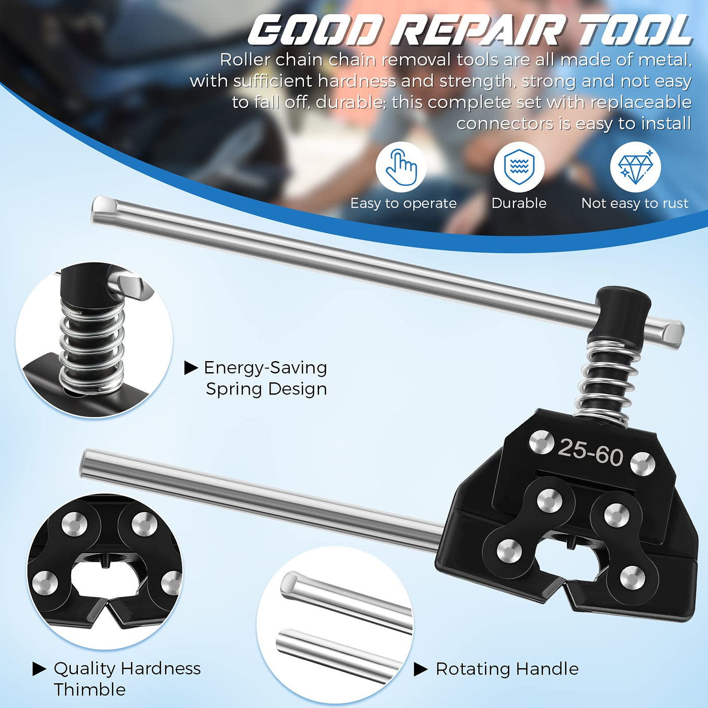 Q: What materials are used in the construction of this roller chain kit?A: The roller chain installation tools are made of durable all-metal components, providing sufficient hardness and strength for long-term use, while the roller chain and connecting links are crafted from alloy steel.