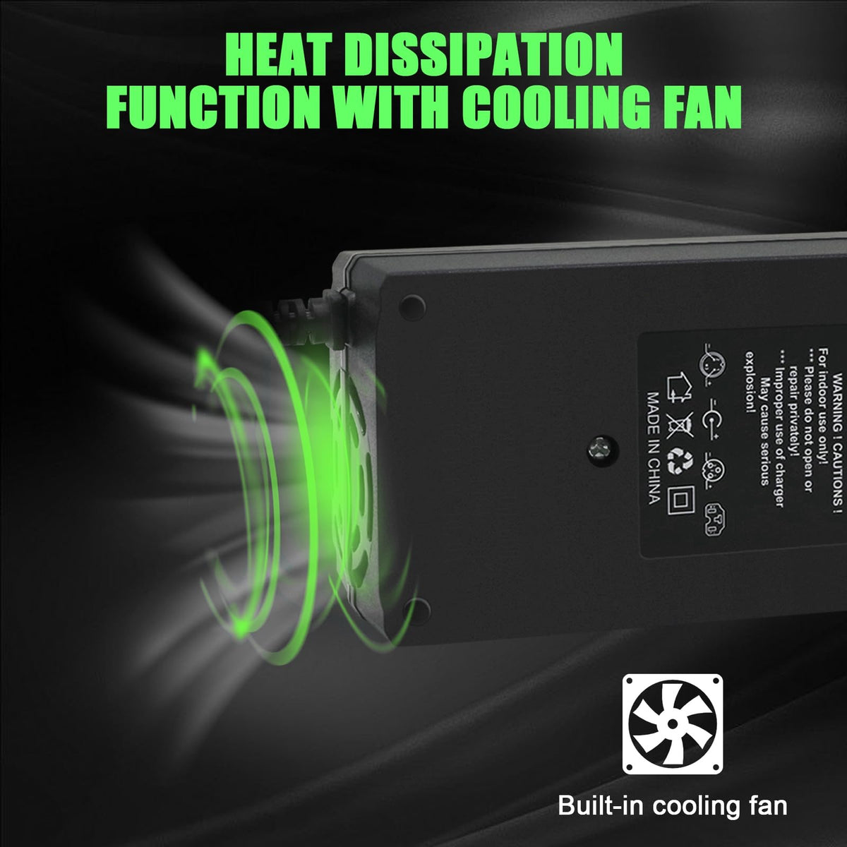 LED Indicator and Durable Shell: The built-in LED indicator allows easy monitoring of the battery charging status, while the robust shell and cooling fan enhance durability and prevent overheating.