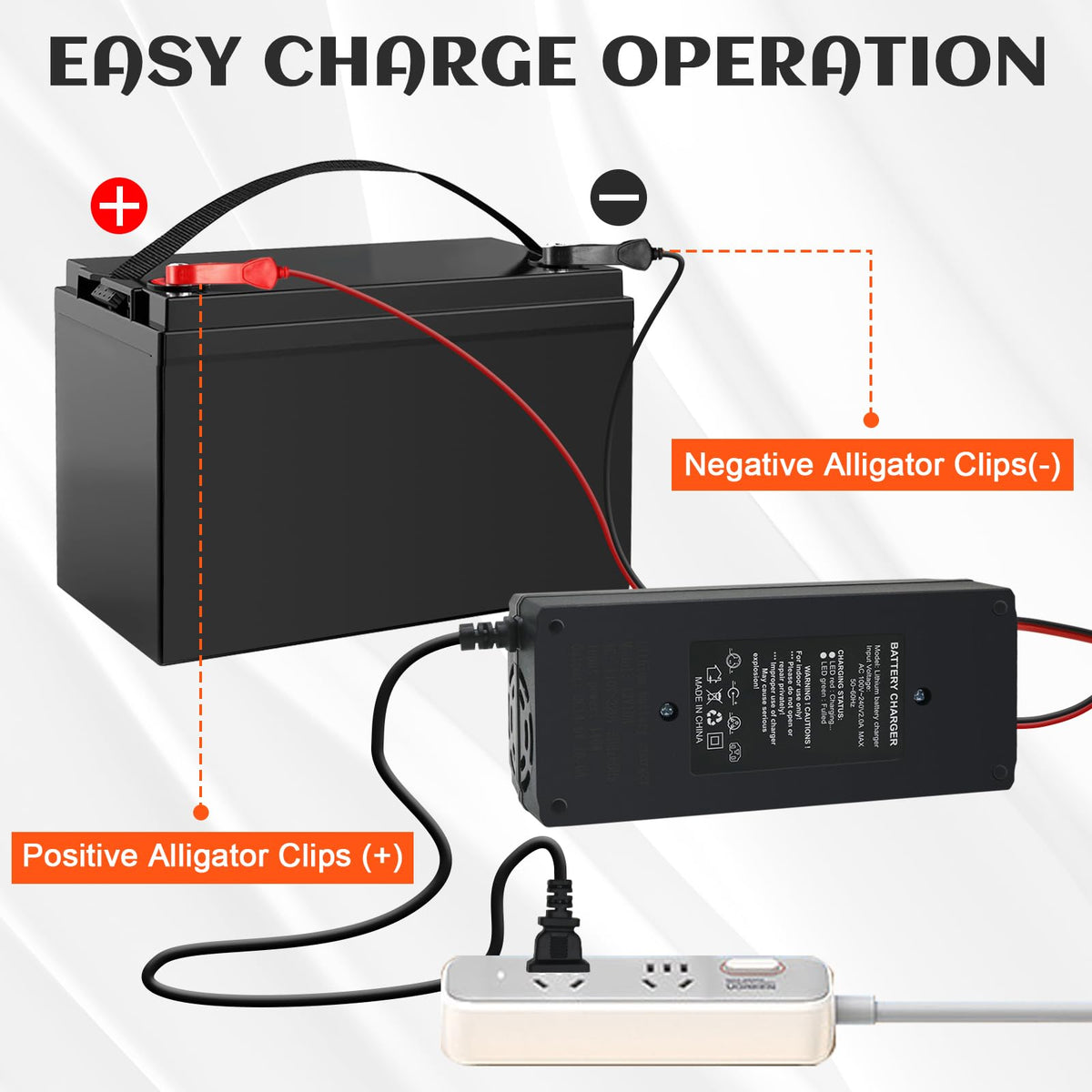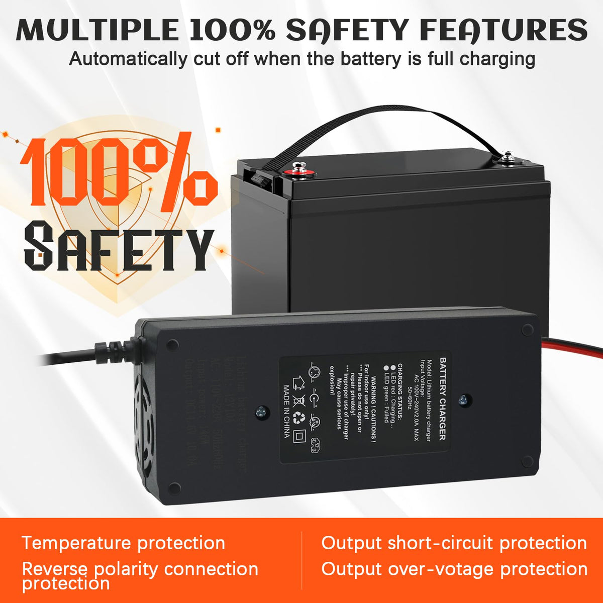 Q: What safety features are included in this battery charger?A: The charger includes several built-in safety protections such as overcharge protection, over temperature protection, short circuit protection, and overvoltage protection to ensure safe and reliable charging.