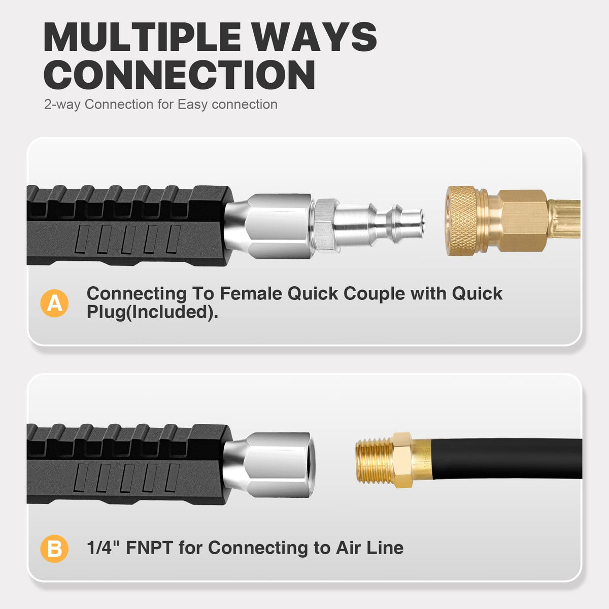 ?What in the box? 1 pcs 1/4'' FNPT Extended Reach Dual Head Tire chuck 1 pcs standard male quick plug 1pcs teflon tape bonus ?Why this air chuck set? Quality Made, high quality brass body air chuck with brass quick plug, will serve you faithfully for years. 2-way Easy Connection, female 1/4'' FNPT thread for connecting to air compressor's air line, standard 1/4'' male quick plug for connecting to air lines' female quick couple. Extended Reach & Dual Head Inner Thread Design, 12'' lengthened air rod for hard-to-reach tire valves, and quality Inner Thread lock design dual head, especially designed for truck or RV's dual wheel. Wide Application, Ideal for schrader valve, widely applicable for various vehicles, bikes, motorcycle, car, etc. ?How to make a better operation? Put it on tire valve stem then push and lean it slightly to ensure no air leakage and easy one-hand operation. Align it back straight to the valve stem to take it off.