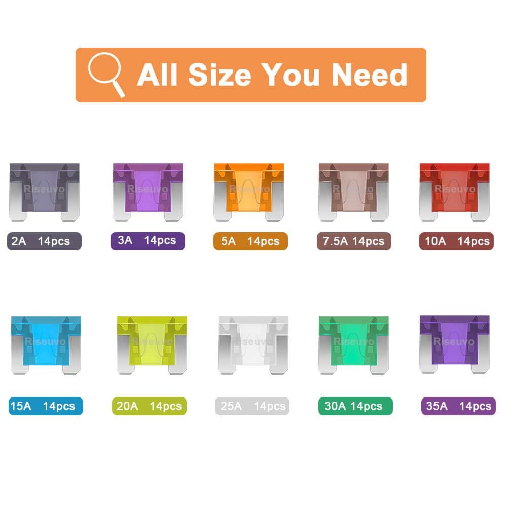 Q: What AMP ratings are included in the Riseuvo fuse kit?A: The Riseuvo low profile mini blade fuse kit includes a total of 140 pieces with various AMP ratings: 14 pieces of 2 AMP, 14 pieces of 3 AMP, 14 pieces of 5 AMP, 14 pieces of 7.5 AMP, 14 pieces of 10 AMP, 14 pieces of 15 AMP, 14 pieces of 20 AMP, 14 pieces of 25 AMP, 14 pieces of 30 AMP, and 14 pieces of 35 AMP.