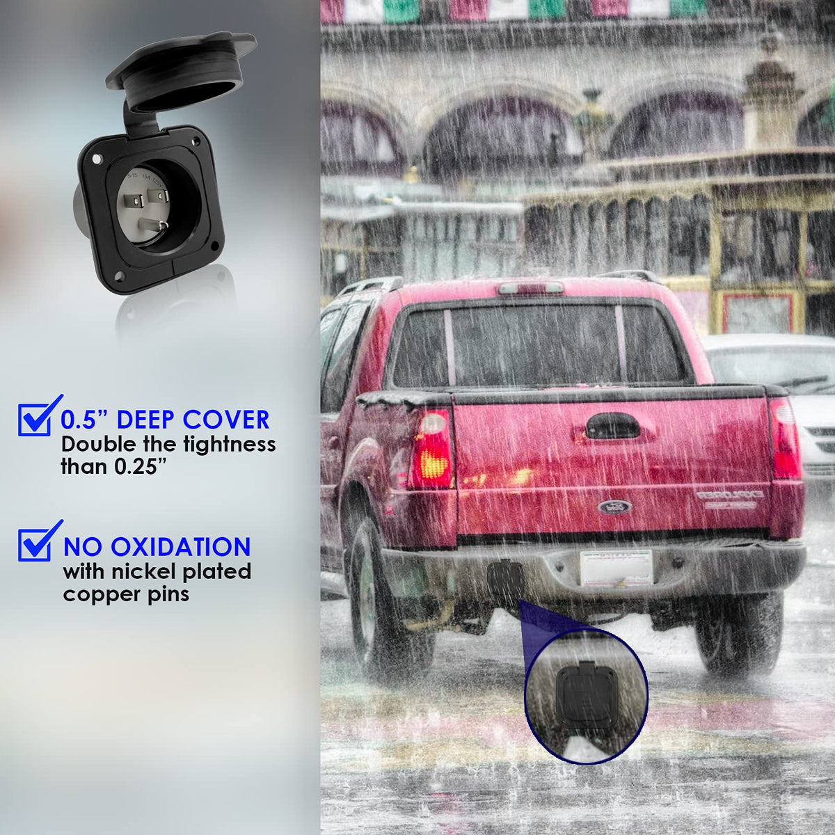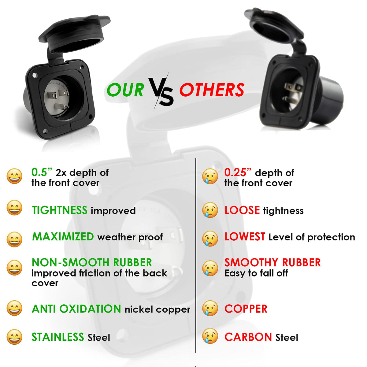 The NEMA 5-15 trailer power plug is designed and manufactured to high standards to meet our customers ' needs. The upgraded male electrical outlet comes with a deeper front cover and a more stable back cover. With 4 simple steps, the male outlet plug will be installed right away. The RV plug outlet can be applied to many different scenarios such as boats, trailers, even snow shovels. The RV ac outlet is a premium solution for RV receptacle 15a purposes. Moreover, we provide caring service and 24-hour reply for the customers. FEATURES ? Upgraded version for better stability (More friction with marine 110v outlet) ? Simple and easy installation with four steps for male receptacle outlet ? Wide application for RVs, Boats, Trailers, Sheds, Snow Shovels etc. with marine power cord cover ? Premium quality and strictly tested with ac plug port FITS FOR ? SJT, SJTO, SJTOO, SJTW, SJTOW, SJTOOW, SJE, SJEO, SJEOO WIRE GAUGE ? 16/14/12 AWG for power inlet box. Do not use smaller gauge wire as this will result in overheating and possible electrical fire. CABLE COLOR SCHEME ? Black - Load (support 125V) ? White - Neutrual ? Green - Equipment Ground TOOLS REQUIRED FOR ASSEMBLY ? Pencil electric drill hole saw (2 '' '' hole saw recommended) ? 1/8 '' '' Drill bit flat blade screwdriver #8 pan head stainless ? Steel screws (4) cutting / Wire stripping pliers SPECIFICATION ? Product Name : 15 Amp Inlet Trailer RV AC NEMA 5-15 Plug ? Application : Generator or battery charger plug ? Weight : 0.3 lbs ? Color : Black PACKAGE INFORMATION ? 1 x flanged inlet receptacle ? 4 x Steel screws for block heater plug ? 1 x waterproof receptacle installation sheet