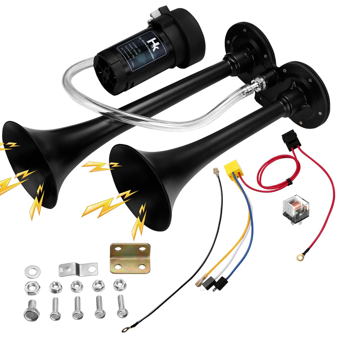 150Db Super Loud Dual Trumpet Air Horn Kit With Compressor For Vehicles, Trucks, Trains, Boats - 12V, Black