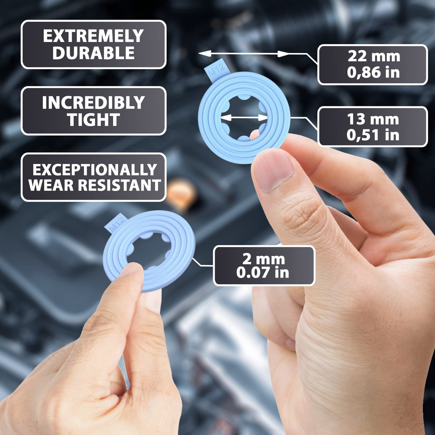 Q: What are the dimensions of the oil drain plug crush washers?A: Each oil drain plug washer has an inner diameter (ID) of 0.43 inches (11mm), an outer diameter (OD) of 0.78 inches (20mm), and a thickness of 0.09 inches (2.5mm). These dimensions ensure a snug and secure fit for your oil drain plug.