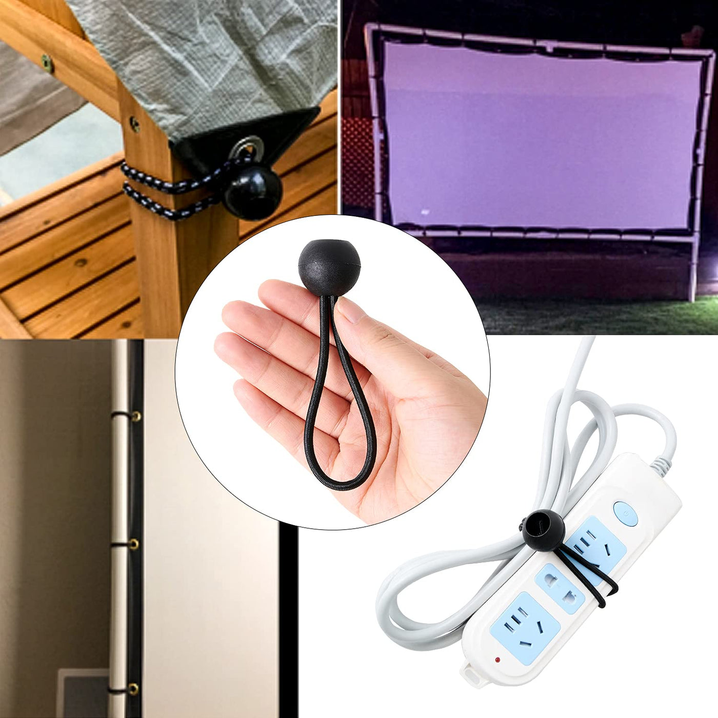Q: What are the main uses for the 16 Pack Bungee Balls Cords?A: The 16 Pack Bungee Balls Cords are versatile and can be used for securing canopies, tarps, shades, camping gear, tents, poles, wires, sleeping bags, and household items. They are designed to provide a strong and weather-resistant tie-down solution for various applications.