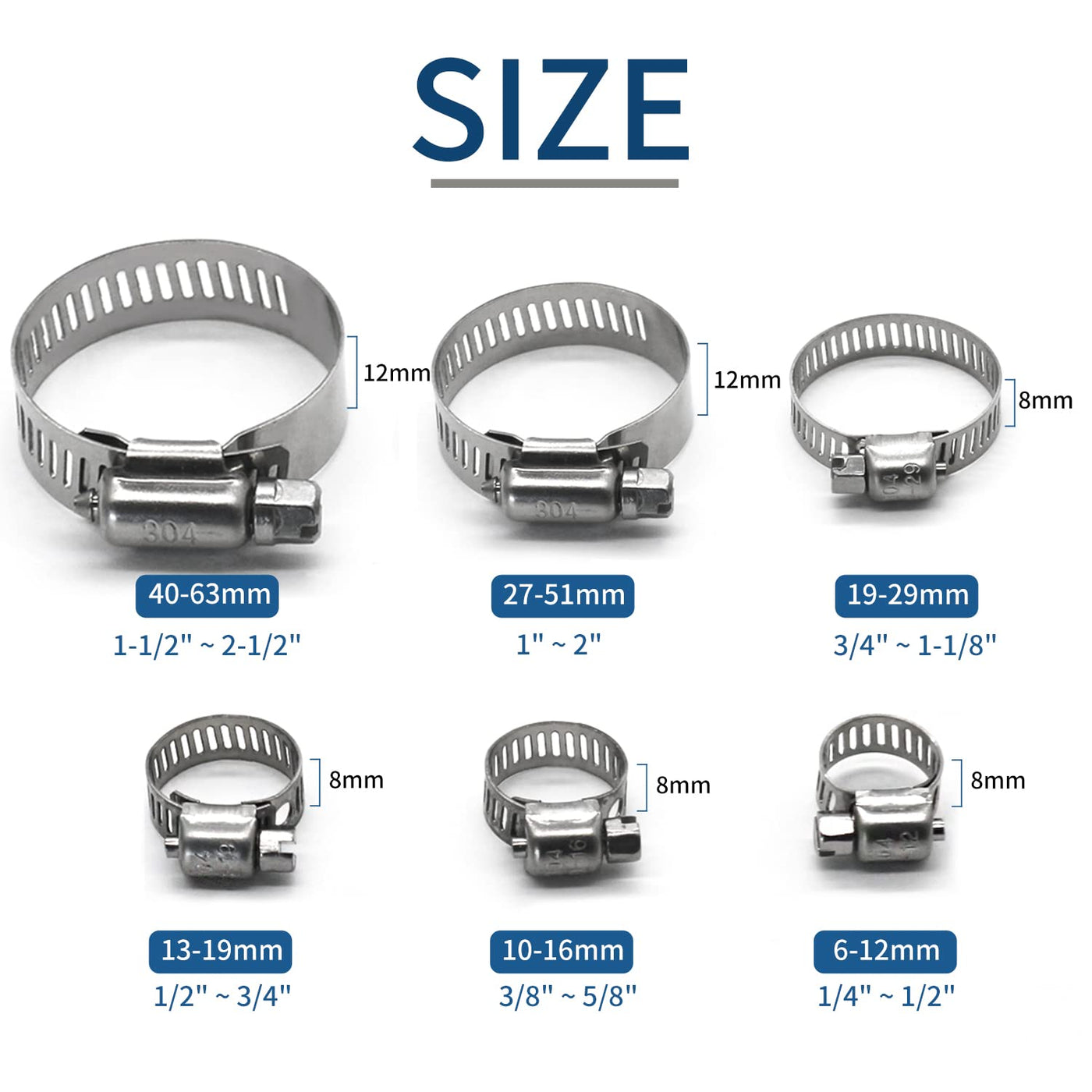 Q: What should I consider before purchasing these hose clamps?A: Before purchasing, it's important to measure the diameter of your pipe or hose to ensure that it falls within the 1 inch to 2 inch size range of these clamps.