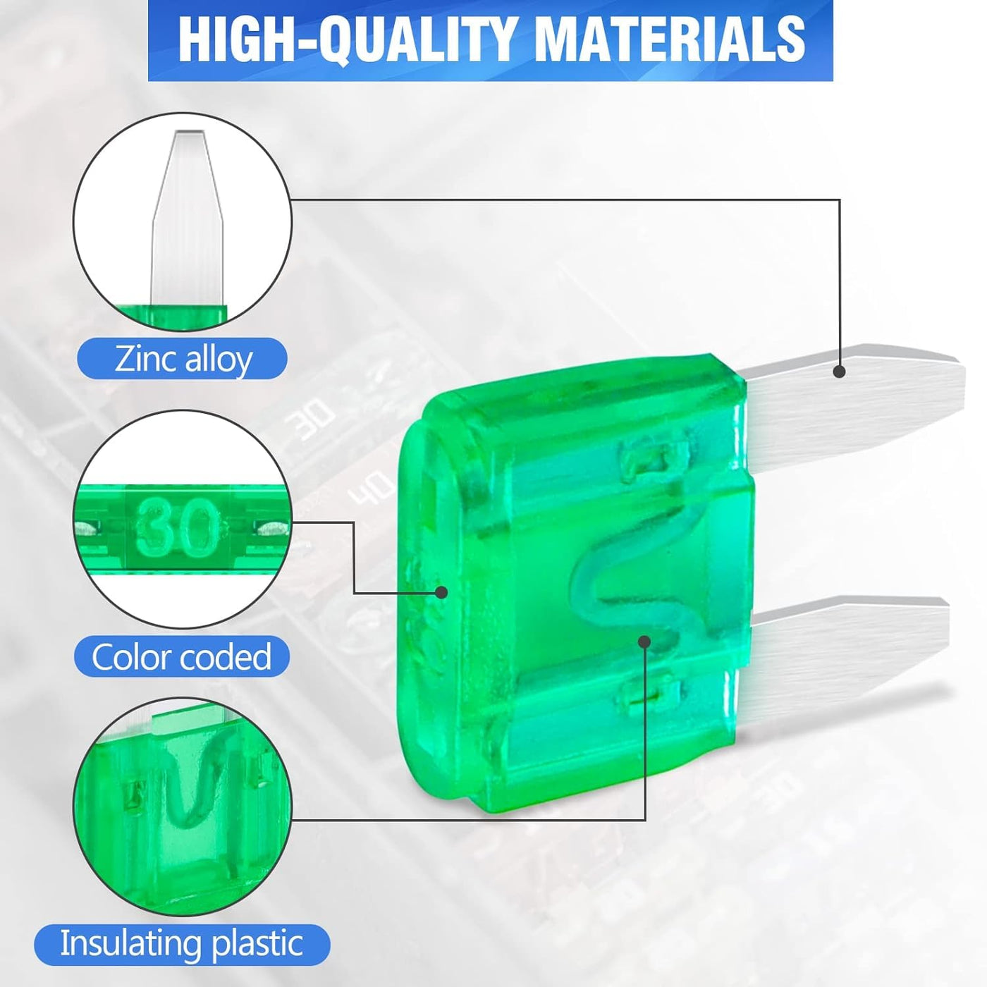 Q: What materials are the 30A mini fuses made from?A: These mini fuses are made of premium zinc alloy, which ensures durability and effective performance in protecting against shocks and sparks in automotive systems.