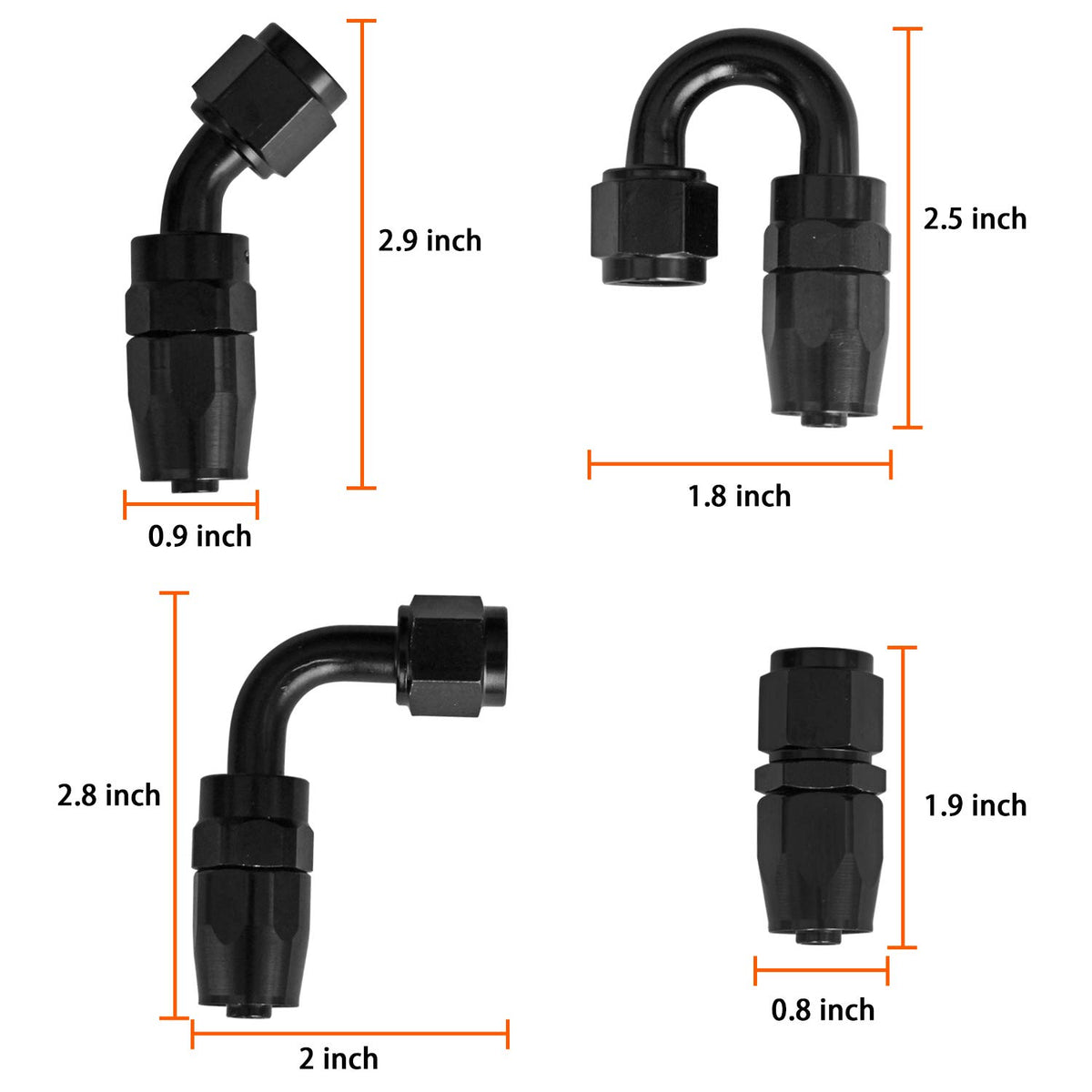 Specification: Color:Black Size:AN-6 Inner hose Materail:Polyurethane material hose Outside Materail:Nylon and Stainless Steel Fitting Material: High Quality 6061 Aluminum Alloy Package include: 1 pcs 16FT AN-6 Nylon Braided Hose 4 pcs AN-6 Straight Reusable Swivel Hose End 2 pcs AN-6 45 Degree Reusable Swivel Hose End 2 pcs AN-6 90 Degree Reusable Swivel Hose End 2 pcs AN-6 180 Degree Reusable Swivel Hose End 6 pcs 6AN Hose Separator Clamp 2 pcs 6AN male coupler How to Cut: 1.Measure your hose and find desired length. 2.Tape hose at measured length needed for application. 3.Cut hose threw the tape you have placed.(This keep the steel braid from fraying) 4.Remove the tape. 5.Slide one end of hose into end of fitting. 6.Insert the other half of fitting into the hose and begin to push and screw the fitting together. 7.Make sure all connection are tight.
