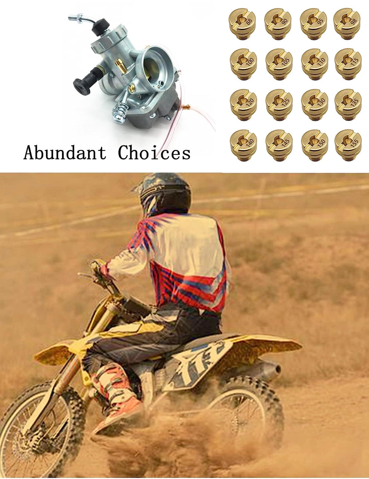 Q: What sizes are included in the 16pcs Carburetor Jet Kit?A: The 16pcs Carburetor Jet Kit includes main jet sizes: 88, 90, 95, 98, 100, 105, 110, 115, 120, 125, 130, 135, 140, 145, 150, and 155.