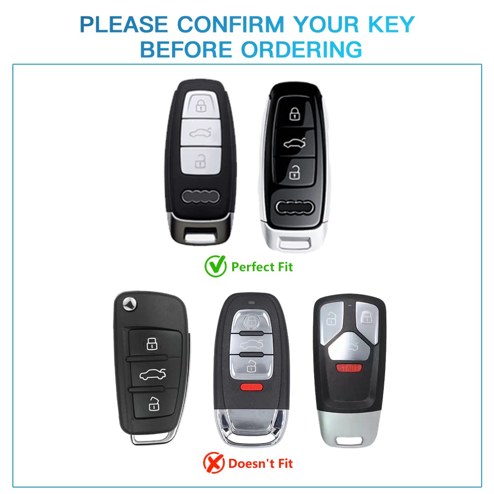 Anti-Fingerprint The car key fob case for Audi is effectively anti-fingerprint, and looks new even after long-term use. Anti-Scratch This key cover for Audi fits snugly around the key and greatly reduces the impact and damage to the key. Portable & Good Signal The smart remote key fob cover for Audi comes with a pretty key chain for easy carrying and ready access. The key shell for Audi keeps your keys working well without affecting the key signal, and allows easy access to the buttons. Stylish & Durable The shock-absorbing design of the key fob protector for Audi prevents your car keys from breaking and scratching. This key case for Audi contours well to the shape of the keyless smart remote entry key, shrapnel design for easy access. PRODUCT SPECIFICATIONS Name: Car Keyless Entry Remote Smart Key Fob Cover for Audi Material: TPU Package List: 1*Key Fob Cover,1*Key Chain,1*Mini Screwdriver. FITMENT for Audi A6 A7 A8 Q8 e-tron 2019 2020 2021 2022 for Audi Q7 S6 S7 SQ7 SQ8 2020 2021 2022 for Audi RS6 RS7 2021 2022 for Audi A3 S3 2022 NOTE Please refer to the key in 2nd picture before ordering. The package does not include the key. Please save the mini pick and screwdriver for future use. INSTALLATION METHOD 1. Snap the car key into the key shell. 2. Align the back cover with the groove on the key case and snap it into place.. 3. If it's stuck, use the mini pick to pry off the edge corners of the key case. 4. Loosen the screw pin of the D-buckle. 5. Confirm the position. 6. Tighten the screw pin. 7. Finish.