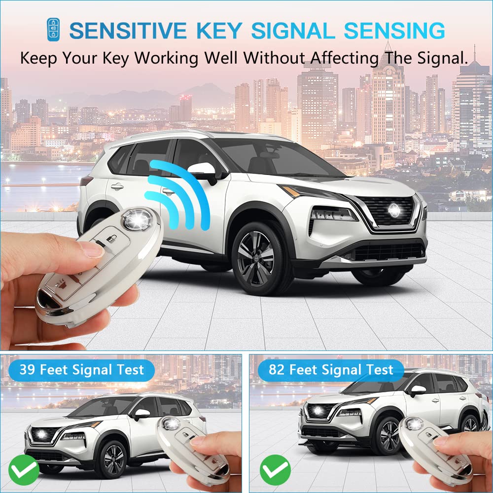 Q: Does the key fob cover affect signal transmission?A: No, the key fob cover is designed to maintain signal transmission without interference, allowing you to use your key fob from up to 160 feet away.