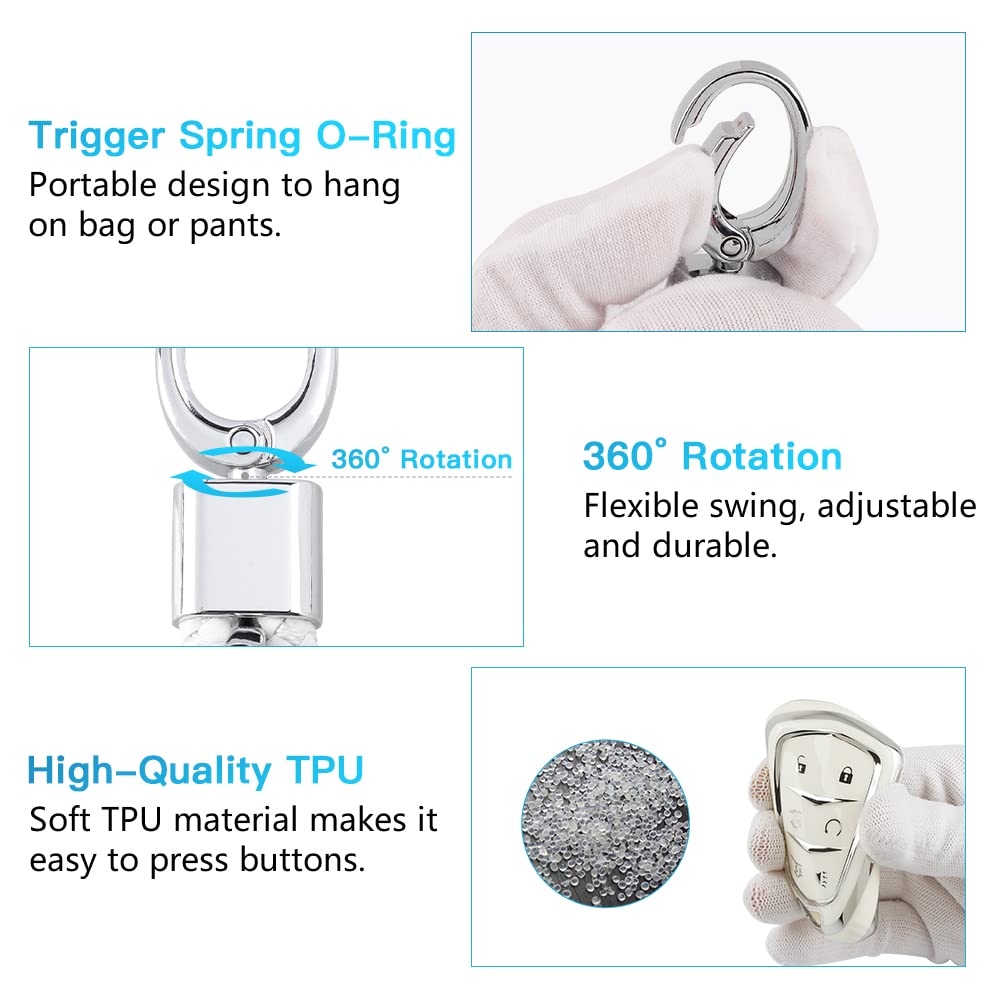 Anti-Fingerprint The TPU key fob cover for Cadillac Escalade is effectively anti-fingerprint, and looks new even after long-term use. Anti-Scratch This key cover for 2015 - 2020 Escalade fits snugly around the key and greatly reduces the impact and damage to the key. Portable & Good Signal The smart remote key fob cover for Cadillac Escalade comes with a pretty key chain for easy carrying and ready access. The key shell for Cadillac Escalade keeps your keys working well without affecting the key signal, and allows easy access to the buttons. Stylish & Durable The shock-absorbing design of the key fob protector for Cadillac Escalade prevents your car keys from breaking and scratching. This key case for Cadillac Escalade contours well to the shape of the keyless smart remote entry key, shrapnel design for easy access. PRODUCT SPECIFICATIONS Name: Car Keyless Entry Remote Smart Key Fob Cover for Cadillac Escalade Material: TPU Package List: 1*Key Fob Cover,1*Keychain,1*Mini Screwdriver. FITMENT Fit for Cadillac Escalade 2015 2016 2017 2018 2019 2020, Escalade ESV 2015 2016 2017 2018 2019 2020. NOTE Please refer to the key in 2nd picture before ordering. The package does not include the key. Please save the mini pick and screwdriver for future use. INSTALLATION METHOD 1. Snap the car key into the key shell. 2. Align the back cover with the groove on the key case and snap it into place.. 3. If it's stuck, use the small pick to pry off the edge corners of the key case. 4. Loosen the screw pin of the D-buckle. 5. Confirm the position. 6. Tighten the screw pin. 7. Finish.