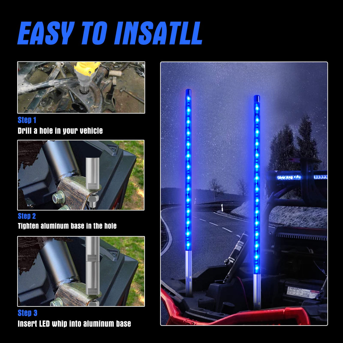 Q: Is the installation process complicated for the LED whip light?A: No, the installation process is straightforward. The whip light comes with a quick-connect aluminum base, allowing for easy installation. Simply drill a hole, insert the light whip, and connect the positive and negative electrodes.