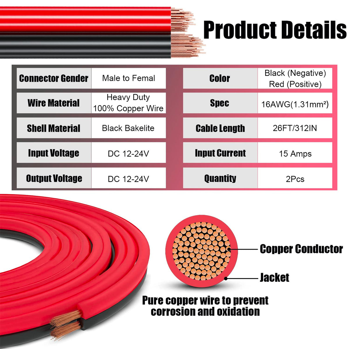 1Pcs 26Ft 12V/24V Heavy Duty Cigarette Lighter Extension Cable 16Awg, 156W/15A Male Plug To Female Socket Adapter Extension Cord