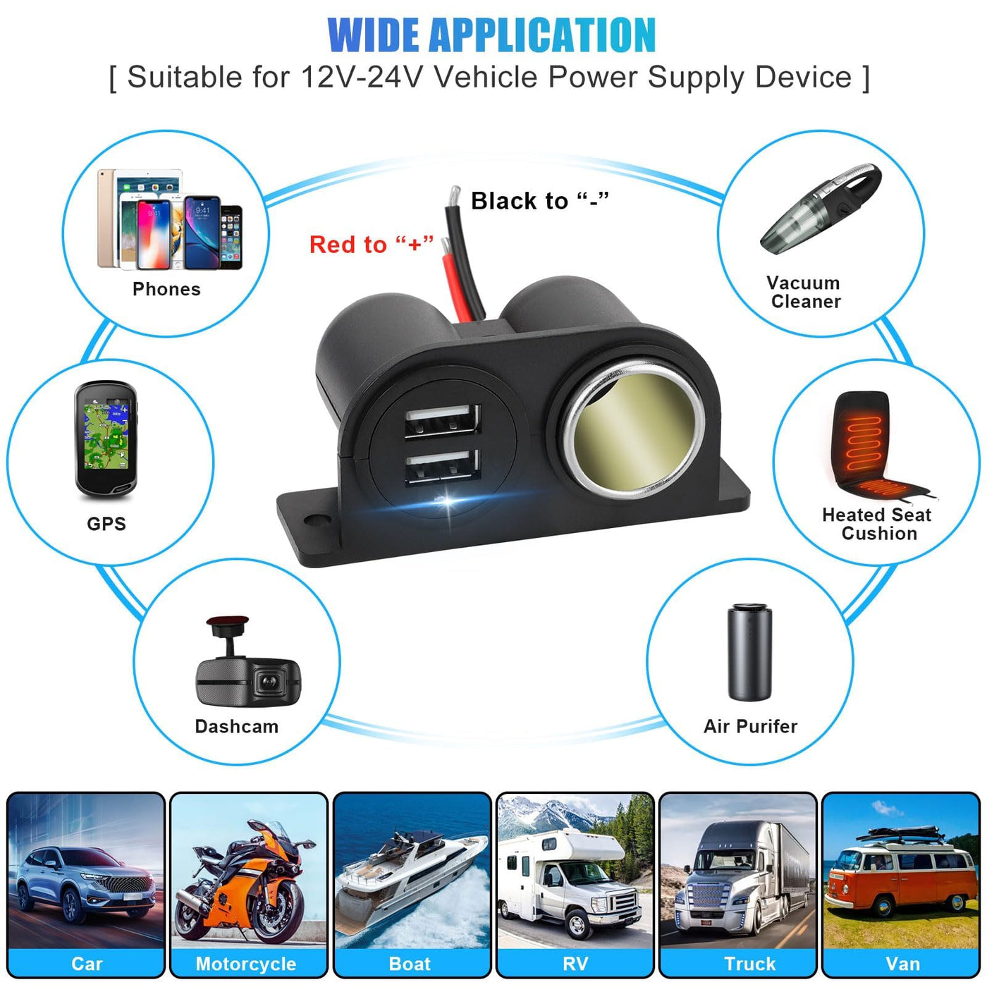 Q: Is this cigarette lighter socket compatible with all vehicles?A: Yes, this 12V cigarette lighter socket is compatible with any vehicle powered by DC 12V/24V, making it suitable for cars, boats, trucks, motorcycles, RVs, ATVs, UTVs, and vans.