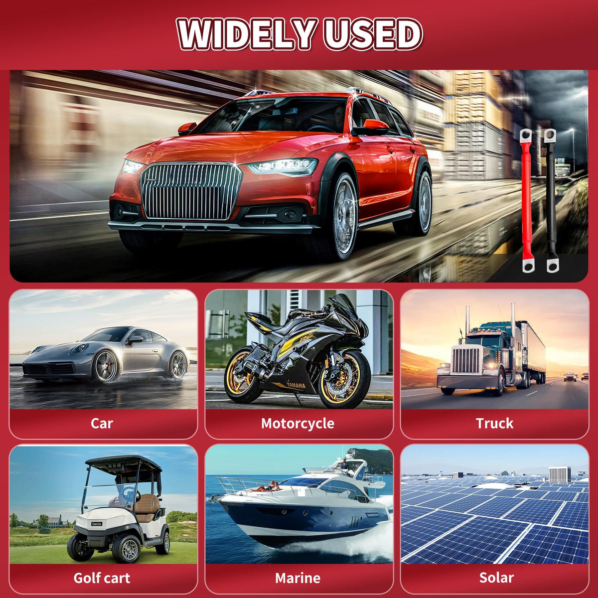Q: How can I use these battery cables in my vehicle?A: These battery cables can be used to connect 12-volt batteries in your vehicle. They are suitable for inverter wiring and can also be used in high voltage DC applications. Simply attach the M8 ring terminals to the battery posts for a secure connection.