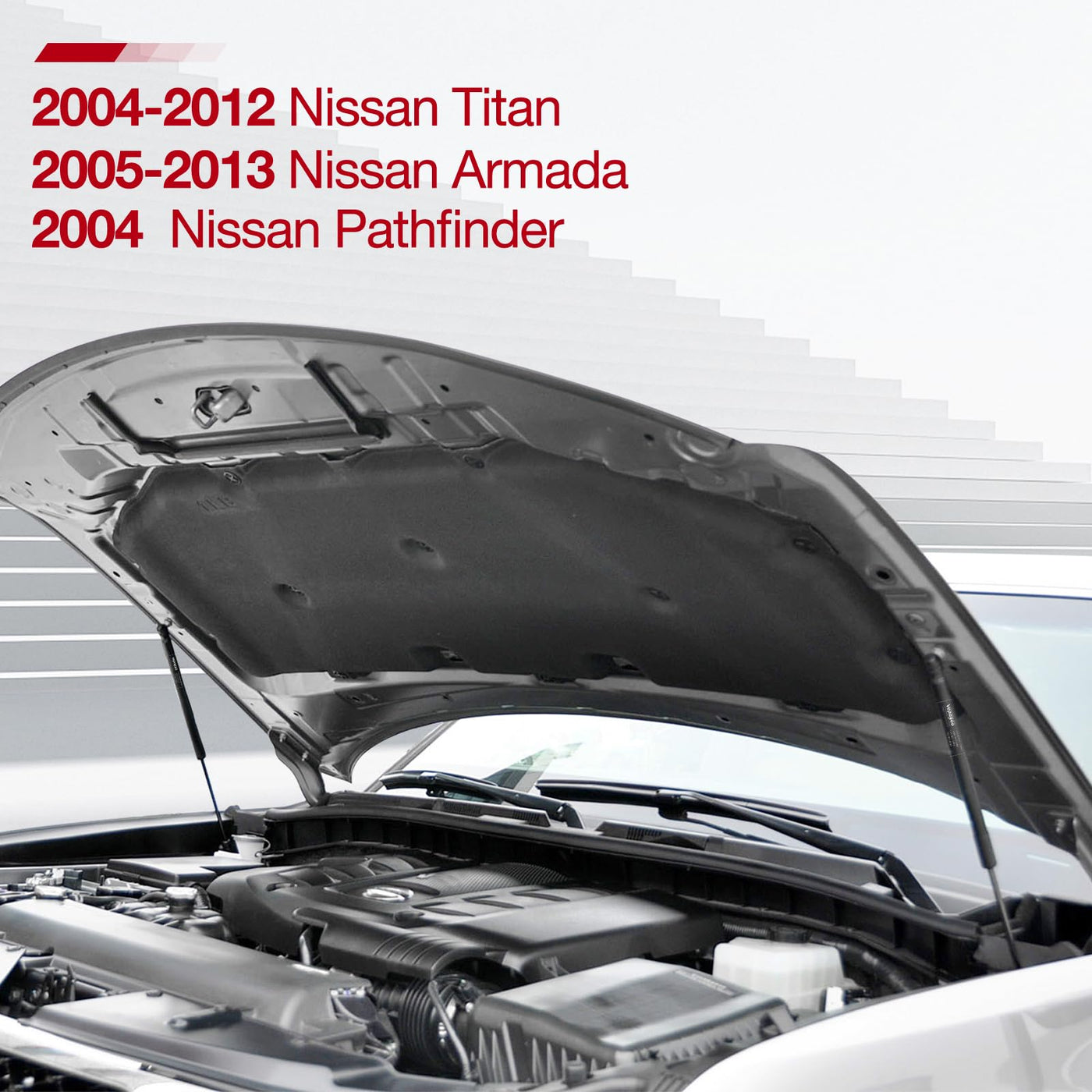 Q: What vehicles are compatible with the Vepagoo 4182 Front Hood Gas Struts?A: The Vepagoo 4182 Front Hood Gas Struts are compatible with 2004-2015 Nissan Titan models, 2004 Nissan Pathfinder, and 2005-2015 Nissan Armada. This makes them a versatile choice for several Nissan vehicles.
