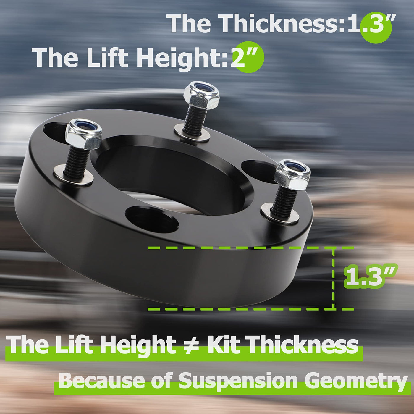 Q: What is the lifting height of the 2" Front Leveling Lift Kits for F150?A: The 2" Front Leveling Lift Kits will raise the front of your F150 by 2 inches. However, due to the suspension geometry, the actual thickness of the kit is less than the lifting height.