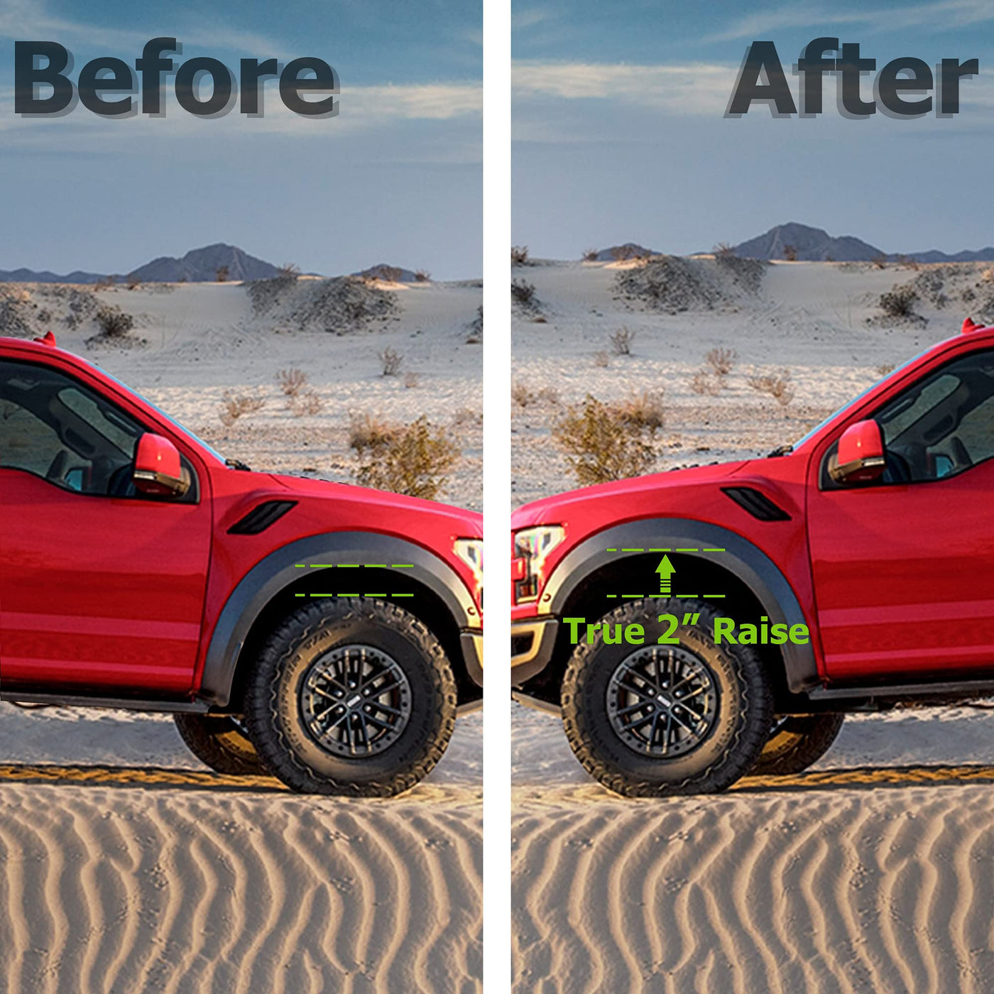 Fitment: 2004-2024 F150 2WD 4WD Notice: This kit will raise the front of your car by 2 inches.Due to the geometry of the suspension,the ratio of lifting height to kit thickness is not 1:1.The actual thickness of the leveling lifting kit itself is less than the lifting height Advantage: Forged from 6061-T6 aluminum alloy,CNC automatic processing,surface anodizing and heat treatment,and hardened grade 12.9 bolts are installed in advance,which not only ensures high precision and stability,but also improves the hardness and corrosion resistance of the material