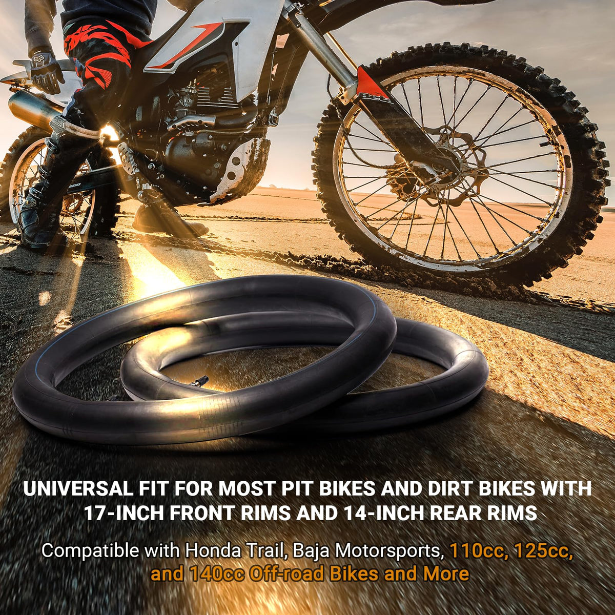 High Compatibility with A Wide Range of Dirt Bike Brands and Models Affordable and high-quality - two qualities that are hard to find in a single product. Our line of replacement parts offers both and more! Enjoy a safe and comfortable ride with inner tubes that can keep up with your dirt bikes performance! If you have any of these dirt and pit bike models, this tire and tube will be perfect for you: ?Apollo DB-X18 125cc RFZ Racing Dirt Bike ?Apollo DB-007 125cc Manual Clutch Dirt Bike ?Baja Motorsports Dirt Runner 90 (DR90) ?Honda Trail 125 ?IMR SK3 140 17/14 ?IMR SK3 155 17/14 ?IMR SK5 190 17/14 ?Kawasaki KDX80 ?Kawasaki KLX125A (2003-2006) ?Kawasaki KLX140A ?Stomp Z3-160 Pit Bike ?Stomp Z3-140 Big Wheel Pit Bike ?TaoTao DB17
