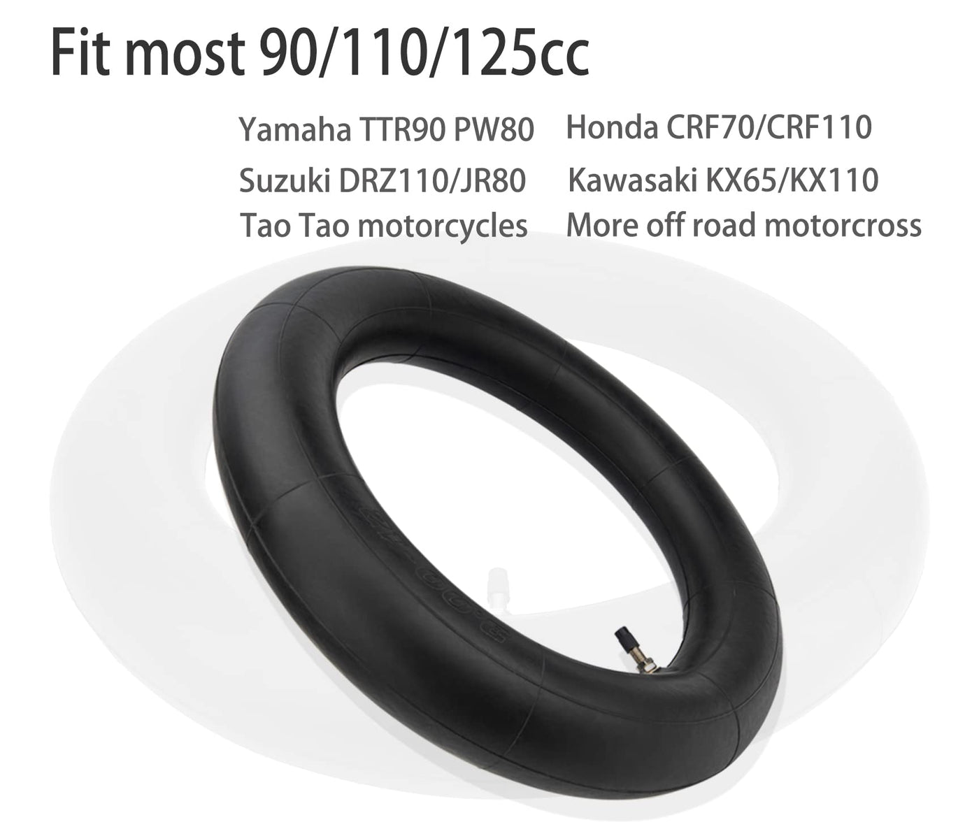 Q: What sizes do these inner tubes fit?A: These inner tubes are designed to fit 12-inch dirt bike tires with widths ranging from 3.00 inches to 3.50 inches, making them compatible with most 90cc, 110cc, and 125cc dirt bike tires.