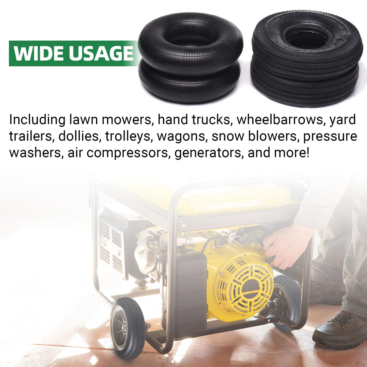 Replace decades-old tires on unused garden wagons or wheelbarrows or keep your hand truck going with these 4.10/3.50-4'' universal replacement tires and inner tubes. These tires are the most common size and type used on wheeled utility equipment including lawn mowers, hand trucks, wagons, and wheelbarrows. With a maximum load capacity of 300 pounds, these tire and inner tube set is suitable for both home and commercial use. They are perfect for free-rolling or idle wheels that require tires for both indoor and outdoor use. The inner tubes' straight and standard valve stem provides ease in inflation with the use of regular hand pumps. You can inflate these inner tubes up to a psi of 30. They are an exact fit with the AR-PRO 10'' tires so there's a low probability of pinching. Haul firewood or vital equipment without worries. The combination of thick natural rubber tires and inner tubes enable the tires to resist flats and punctures. The inner tubes' self-sealing feature brings in added security especially for heavy-load applications. The sawtooth treads work exceptionally well on turf and pavement. It provides maximum traction, directional stability, and maneuverability without damaging the grass or leaving skid marks on the pavement. Unsure about the exact size of your equipment's tires? Check the sidewall of your existing tires. Your tire size should be 4.10/3.50-4''. The approximate outer tire diameter (tire height) is 10.2 inches with an inner diameter (rim size) of 4 inches, and a tire width of 4.10 inches. These tire and inner set have high compatibility with different types and brands of lawn mowers, hand trucks, wagons, and trail-behind attachments. But there may be slight differences especially in tire width so make sure to double-check the tire size before ordering.