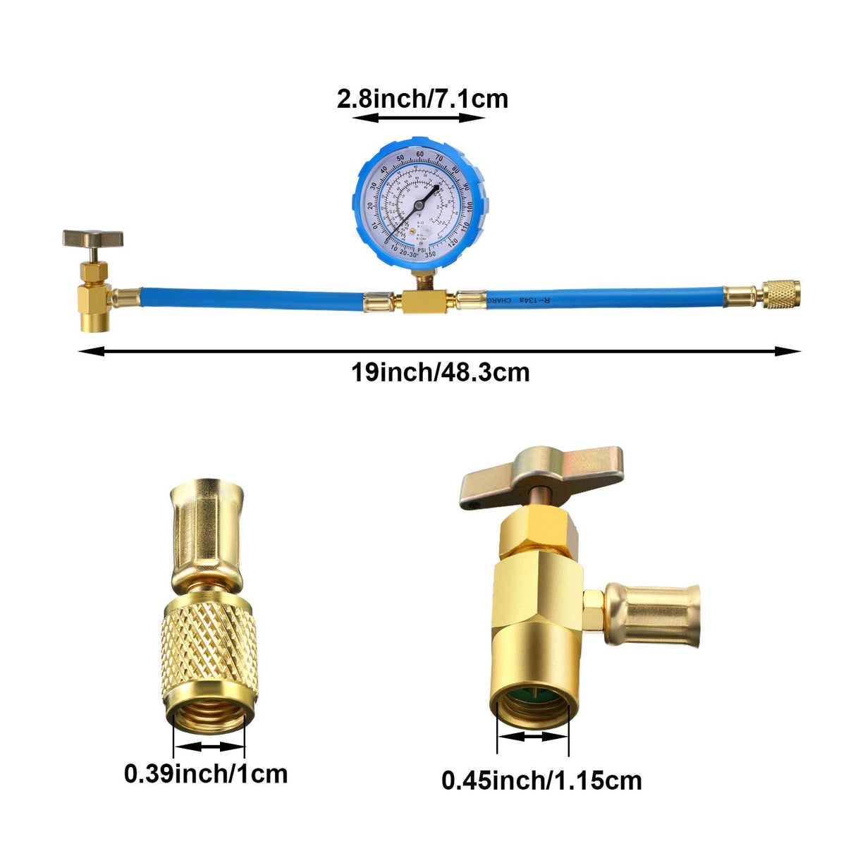 You will get:3 Pieces charging hose with gauge kit includes 2 x BPV-31 and 1 x R134a charging hose with gaugeBPV-31: Good quality and easy to install. The sealing area of the valve is 50 times that of the o-ring. In addition, its sealing force is 180 inch lbs, pressure test at 250 ?, and torque tested with 500 lbs. Corrosion resistant. Replace part No.: AP4502525, BPV31D, GPV14, GPV31, GPV38, GPV56, MPV31. Compatible with 1/4 inch, 5/16 inch, 3/8 inch outside diameter pipes. Material: metal Quantity: 2 packs Color: sliver R12 R22 charging hose with gauge:R-134a can be connected to the R-12 / R-22 service port for easy conversionBuilt-in safety valve to prevent accidental venting of refrigerant90 Degree push and lock coupler with auto shut off.Easy and convenient to use. Gauge has three scale readings of R134, R12 and R22 for your convenienceFits only those cans with the threat of 1/2 inch. If you wan to to use it to R134a can male thread (7/16 inch), you need one adjusted connector.Can be applied for home air-conditioning and car air-conditioning to add refrigeration.Material: copper and rubberQuantity: 1 piecePackage includes: 2 x BPV-31 kit 1 x R12 R22 charging hose with gaugeWarm notice: It is not compatible with refrigerant R134A. Put on your safety glasses and protective gloves before piercing the pipe.