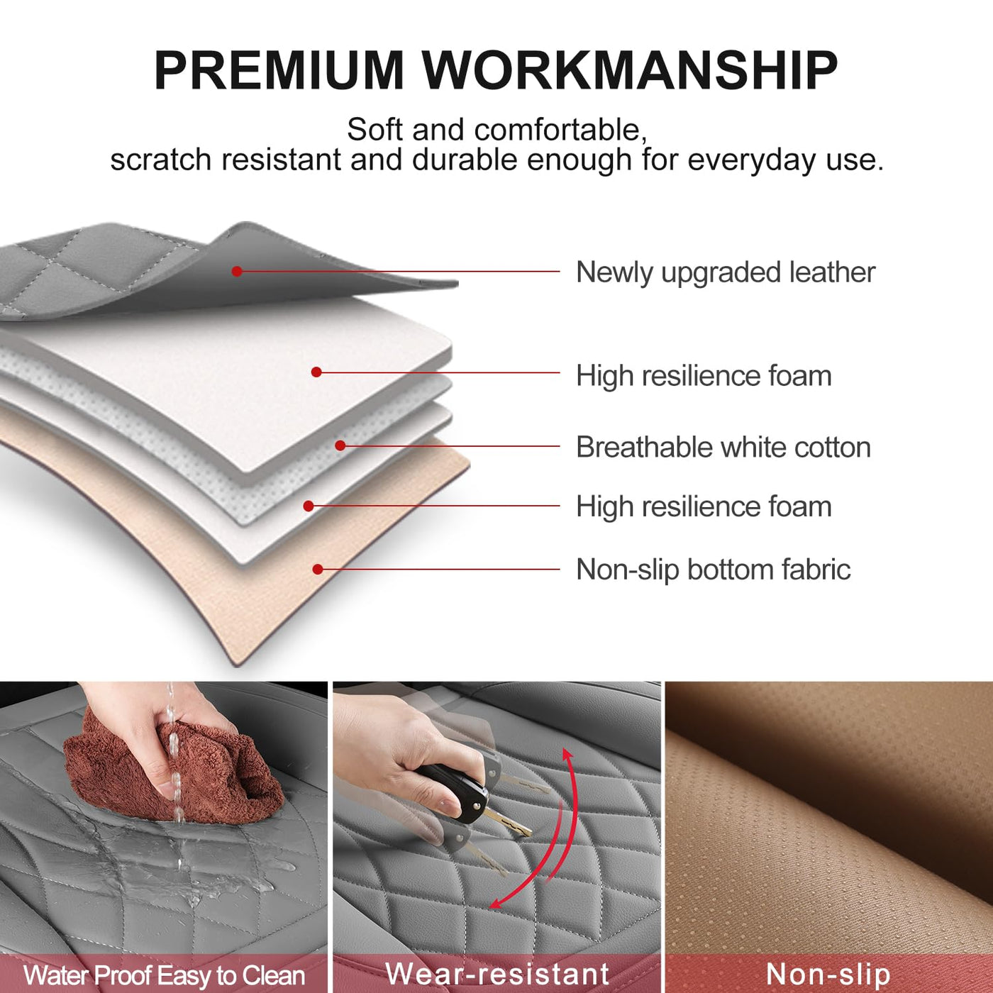 Q: What makes these seat covers durable and comfortable?A: The seat covers are made of soft PU leather, which is both durable and comfortable. They also feature a built-in layer of elastic sponge that provides additional cushioning for your hips during drives.