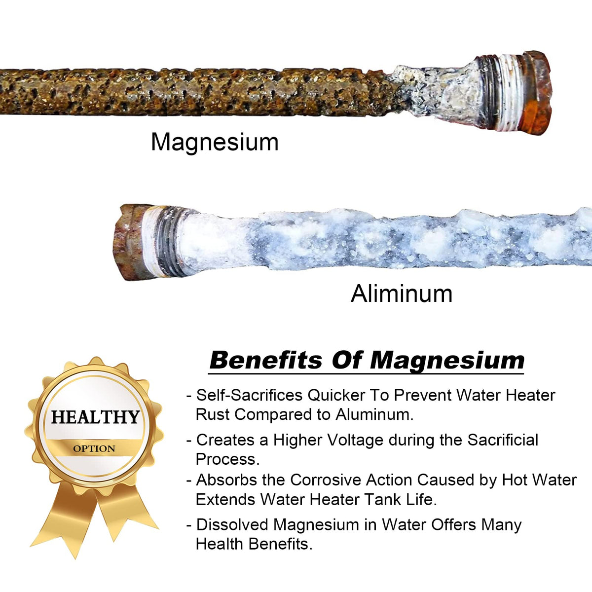 Q: What size and material is the anode rod?A: This anode rod is made of high-quality magnesium AZ63-alloy, measures 9.25 inches in length, and features ¾ inch threads, which requires a 1-1/16 inch socket for installation.