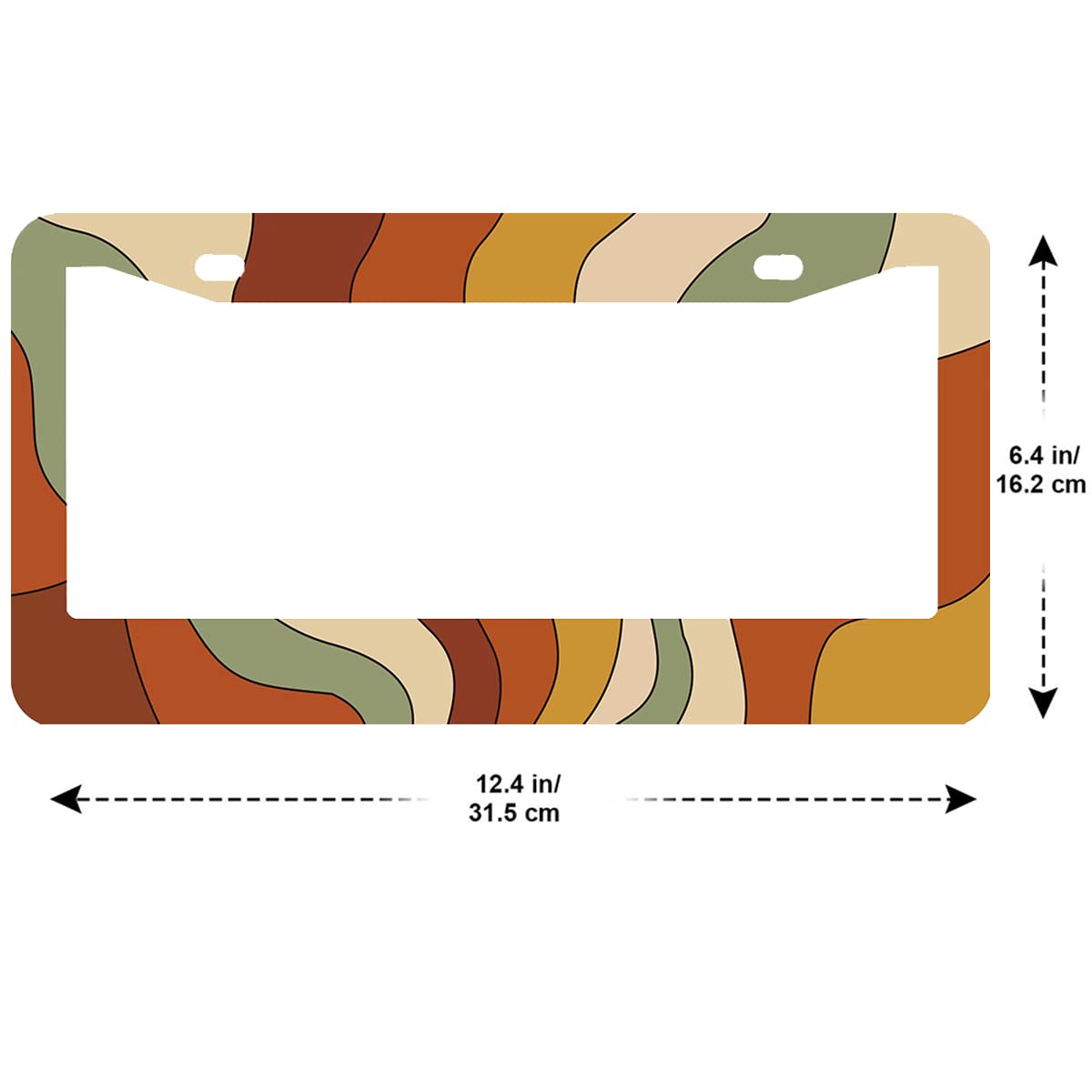 This license plate frame is made of stainless steel and has a size of 6-3/8 '' x 12-1/4 ''. The package includes 2 Stainless Steel Sun Rays Bending License Plate Frames, 8 plastic screw caps, 4 machine screws, 4 self-tapping screws, 4 spacers, 8 washers, and 1 screwdriver. This license plate frame has unique features such as no obstruction of license plate view, which eliminates the risk of police citations for obscuring your license plate number. Its matte aluminum alloy reinforces rigidity, and the recessed screw heads won 't harm other vehicles. The frame also has universal fit-mounting screw location flexibility between 6 ''-8 '' spread and 2 screw stability even if you only have 4 screw holes in the bumper. It can be mounted directly on your bumper or over your vehicle 's factory license plate mounting bracket.