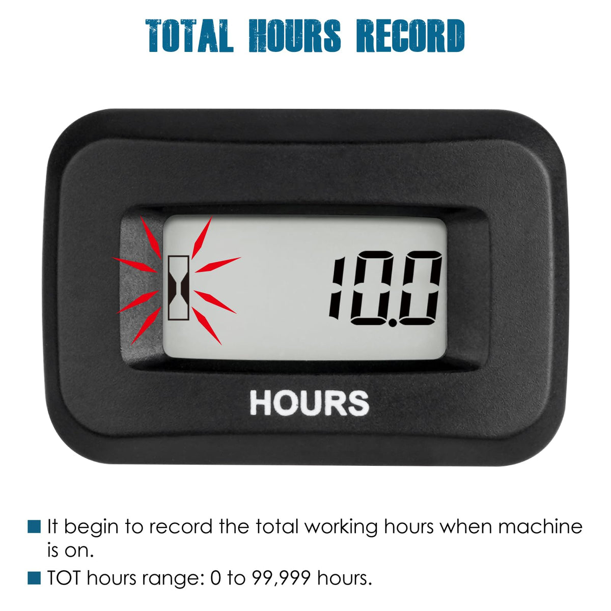 Runleader RL-HM057AD Digital LCD Hour Meter. This hour meter Applicable voltage: AC/DC 5V to 277V , Easy to install , Snap-in design and fits standard panel cut-out . Waterproof design. Product Features:1 Hour Meter (TOT) Features---- Help you track how many hours you put on your machine.? Display shows total run time of engine and remains visible.? Total Hours reading displays from 0 to 999,999 Hours, 0.1 hour accuracy.? TOT hours are non-resettable.2 Applications:? This hour meter suitable for Outdoor Power Equipment? Generators?Agriculture?Construction Machinery?Vehicles?Boats etc... such as:Lawn Mower Garden Tractor Riding mower Leaf Blower Pressure washer chainsaw Snowblower Brush Mower Line Trimmer string trimmer Pressure Washer Portable inverter generator Motorcycle Dirtbike ATV UTV Scooter Paramotor Harley dual-sport bike Golf cart Outboard Jetski Pontoon boat Mercury Raceboat Hovercraft etc...3 Product Specification? Product:RL-HM057AD(2 pieces combination pack)? LCD window size:approx.12.5mm 25mm? Panel Cutout Size:Approx 37.5 24.5mm(1.5 1 Inch)? Product size:46 31 35.3mm? Waterproof rate: IP68? CE ROHS certification? Battery:Internal CR2050 battery , Battery life is up to 6 years, Data retained up to 25+ years? Product accessories:Insert spring,Insert spring sheath ,Instruction manual