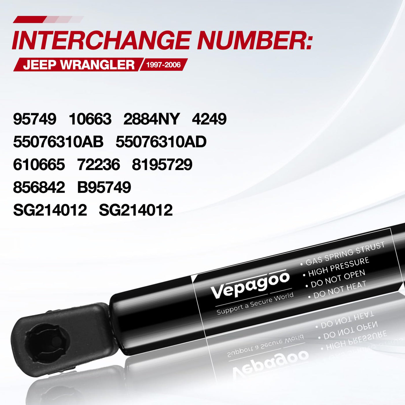 Application Fitment: Description (Fitment) W/ Hardtop 25 1/4' Support Length Fitment Fits The Following Jeep Wrangler Years: 2006 | 65Th Anniversary Edition Sport Utility | W/ Hardtop 25 1/4' Support Length 1997-2006 | Base Sport Utility | W/ Hardtop 25 1/4' Support Length 2003-2006 | Rubicon Sport Utility | W/ Hardtop 25 1/4' Support Length 1997-2006 | Se Sport Utility | W/ Hardtop 25 1/4' Support Length 1997-2006 | Sahara Sport Utility | W/ Hardtop 25 1/4' Support Length 1997-2006 | Sport Sport Utility | W/ Hardtop 25 1/4' Support Length 2004-2006 | Sport Utility | W/ Hardtop 25 1/4' Support Length 2002-2006 | X Sport Utility | W/ Hardtop 25 1/4' Support Length