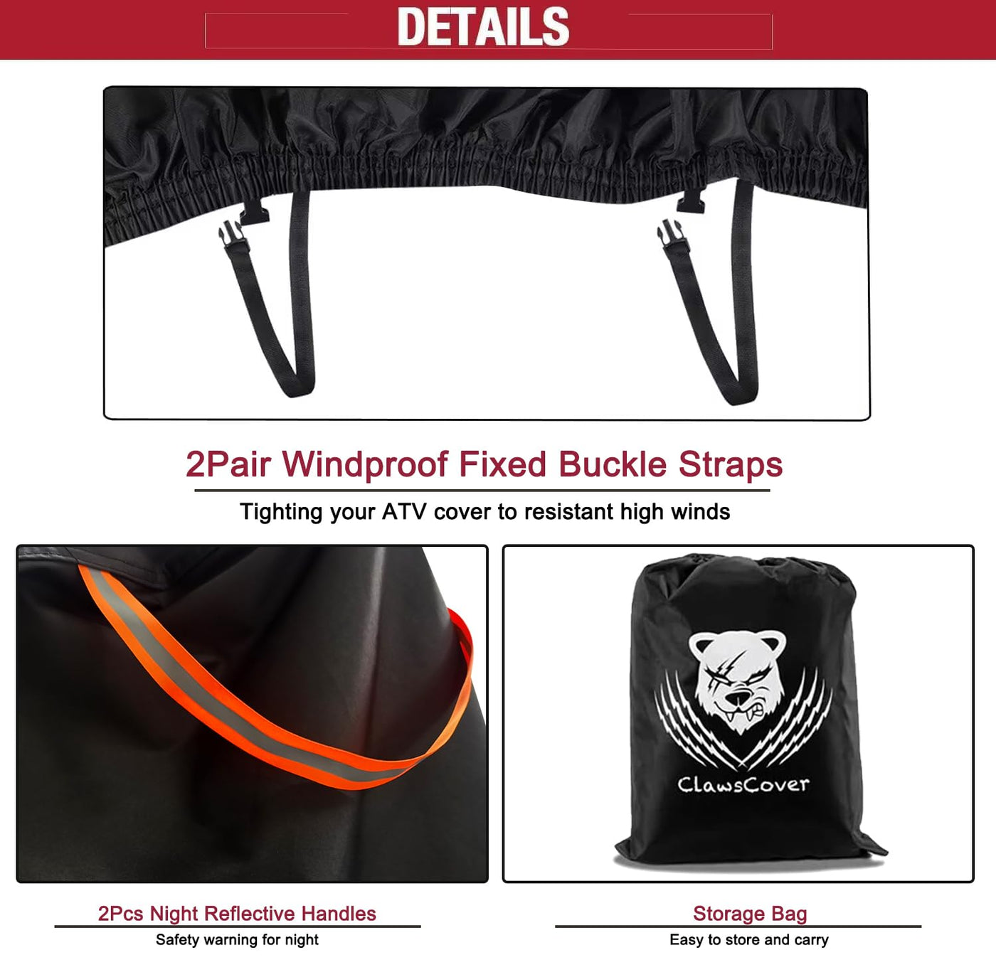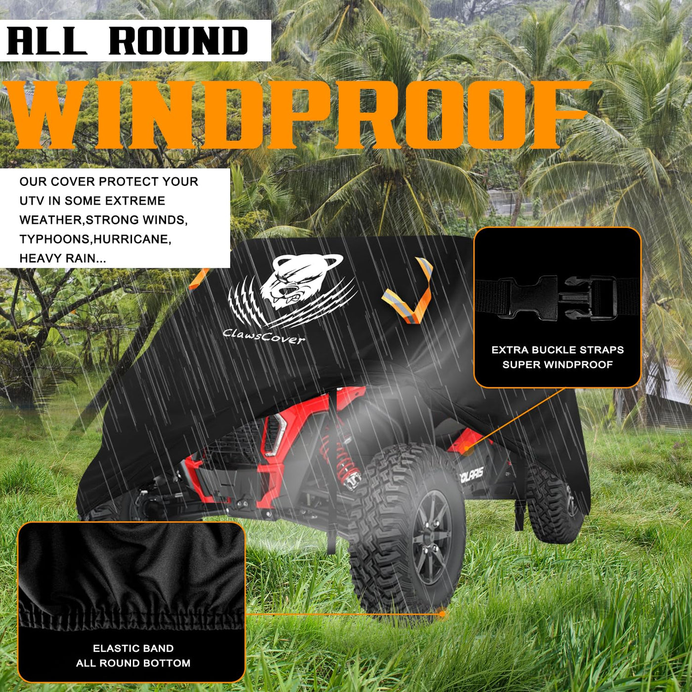 *****About Size***** The size of your utv is less than 2-4 inch than the cover, it is most suitable,so measures size before you pruchase please,Thank You! ClawsCover founder Evan is a motorcycle rider,we have focus on produce outdoor covers,we have motorcycle cover/ATV cover /UTV cover /bike cover /mobility scooter cover/PingPong table cover/outdoor sofa cover, the brand name(ClawsCover) means to can not broken by the wolf's claws,the cover should be durable & waterproof & windproof & sun protection & dust protection and more,we hope all of the covers can solve your needs,save your money and being happy own it. if have any quality defects and wrong size,24 hours contact us for free,we'll give a satisfy answer for you! Specifications:Brand:ClawsCover Size:L x W x H -126x70x75 inches Material: 420D oxford cloth ,Reflective strap :2 straps ,windproof strap:2 adjustable windproof straps, Vents quantity:2 vents, Elastic band:all elastic band at the bottom of cover,other cover just have a part elastic band, Washing:hand wash or washing machine, Package size:13.7x11.8 inches,Features:Heavy duty,Waterproof, Windproof ,Snowproof, Dustproof,Tearproof,UV Protection, Fadeless,Package Inclued: 1 * ClawsCover UTV Cover 1 * Easy To Carry Storage Bag*****Very Important*****1.When use the bike cover please tight the windproof straps avoild to being blown into the water.2.When you storage the cover, keep it dry for longer life. 3.Any cover with vents maybe enter a little water when it is blowing strong winds, please paying particular attention to this situation.4.If the size don't fit your car,you can return it,but don't damage the cover and storage bag,thank you.