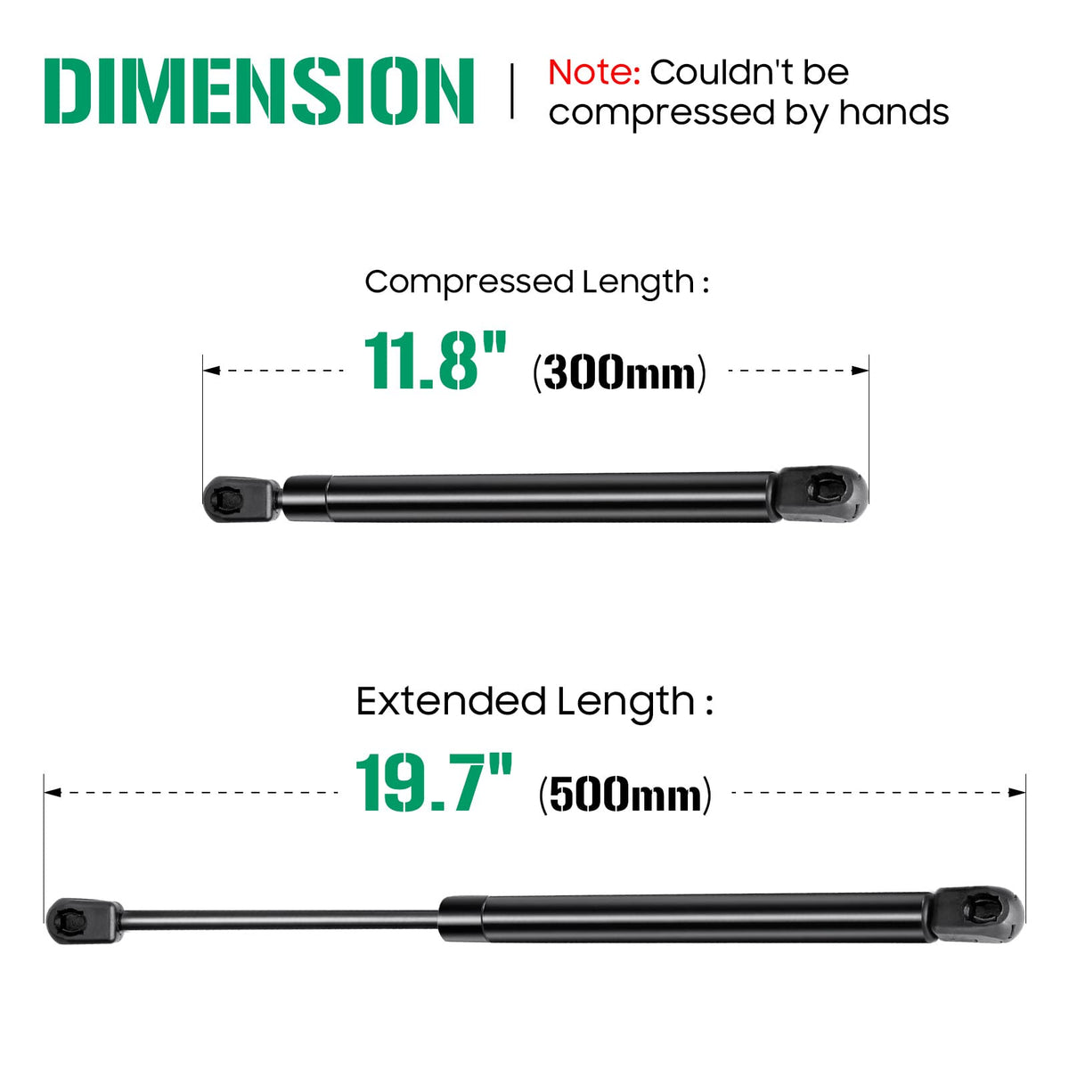 Package: Contains 2 struts and 4 ball studs, the size of the ball stud is 10 mm. Fit: Most suitable support weight is between 32-44 lbs per strut, please check your support cover weight before purchasing. ( Weighing Method: Please weigh the lid 20%-30% away from the hinge ) Note: Couldn't be compressed by hands. Function: After installation, you can easily lift the lid using only the power of one finger. Tips: Under the premise that you can install it flexibly, if the force of the support cover is too strong to close, you can move the installation point to the direction of the hinge.