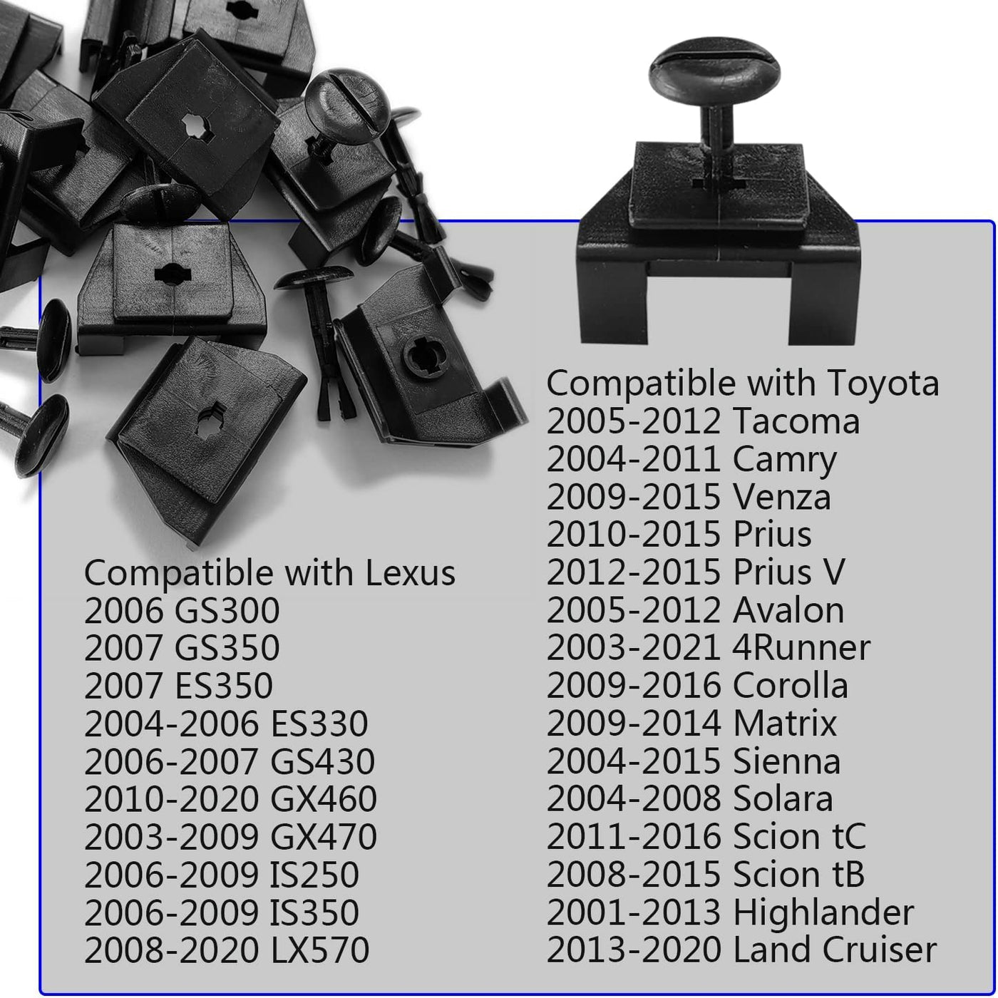 Q: What vehicles are compatible with the 20 Sets Front Fender Bumper Cover Clip Kit?A: The clip kit is compatible with various Toyota and Lexus models, including the Lexus GX460 (2010-2014), Toyota Tacoma (2005-2012), Toyota Land Cruiser (2008-2014), Camry (2004-2011), Corolla (2009-2015), 4Runner (2003-2021), Avalon (2005-2012), Sienna (2004-2016), and Prius (2010-2015).