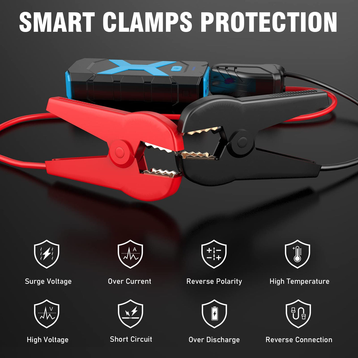 Q: Is the jump starter safe to use, and what protections does it have?A: Yes, the 2000A Jump Starter is equipped with advanced protection technology, including overcurrent protection, overload protection, overvoltage protection, and overcharge protection, ensuring safe use without the worry of incorrect connections or sparks.