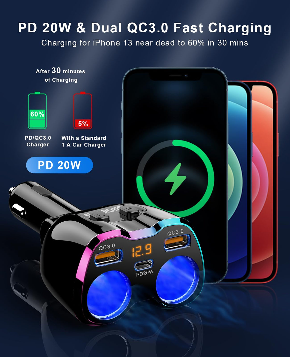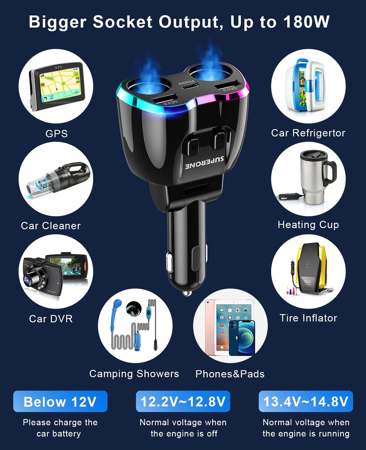 2024 Upgraded Cigarette Lighter Splitter, Superone 180W 2-Socket Cigarette Lighter Adapter With Dual Qc3.0 And 20W Pd Usb C Car