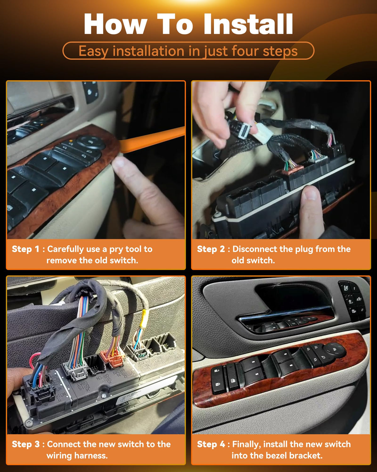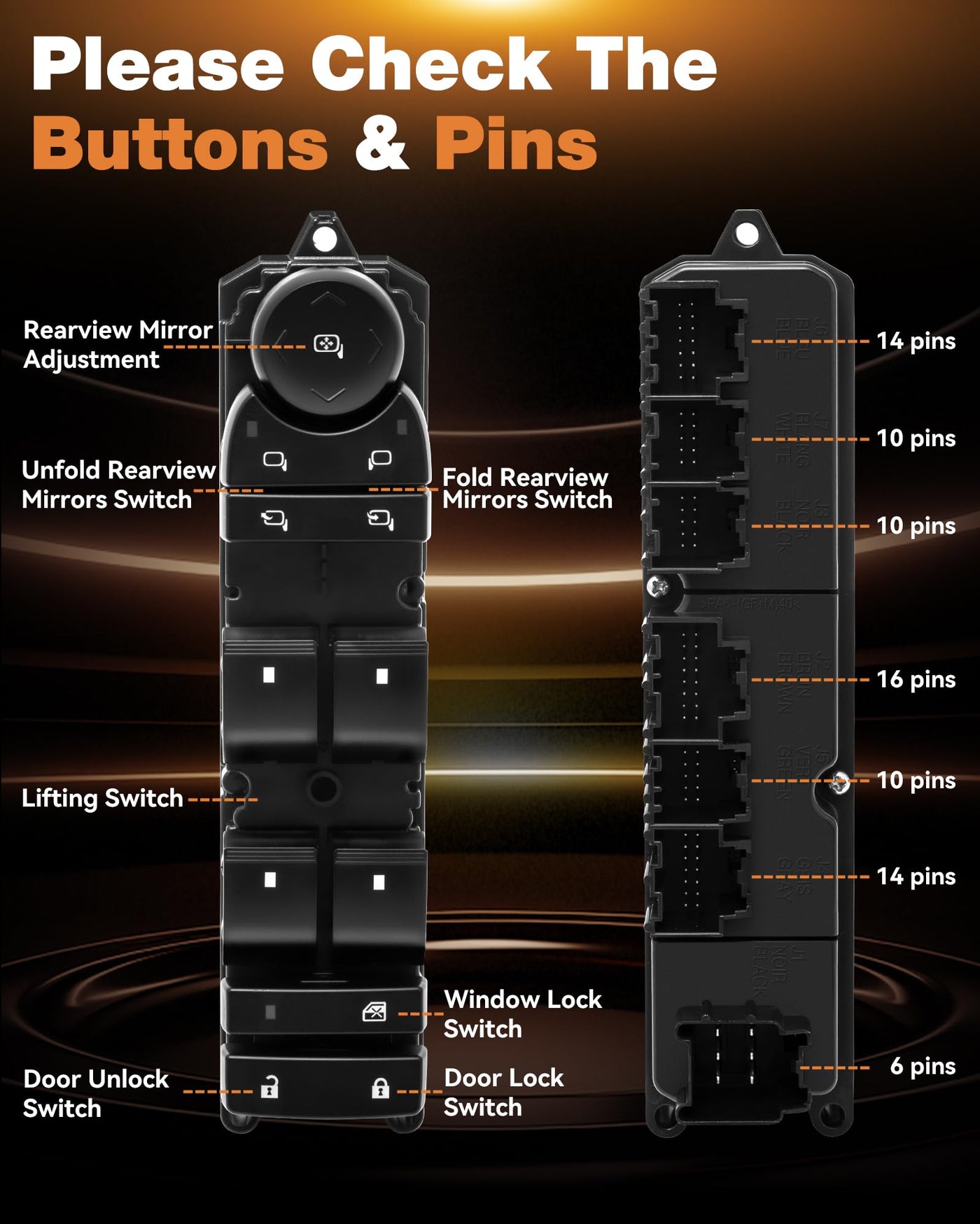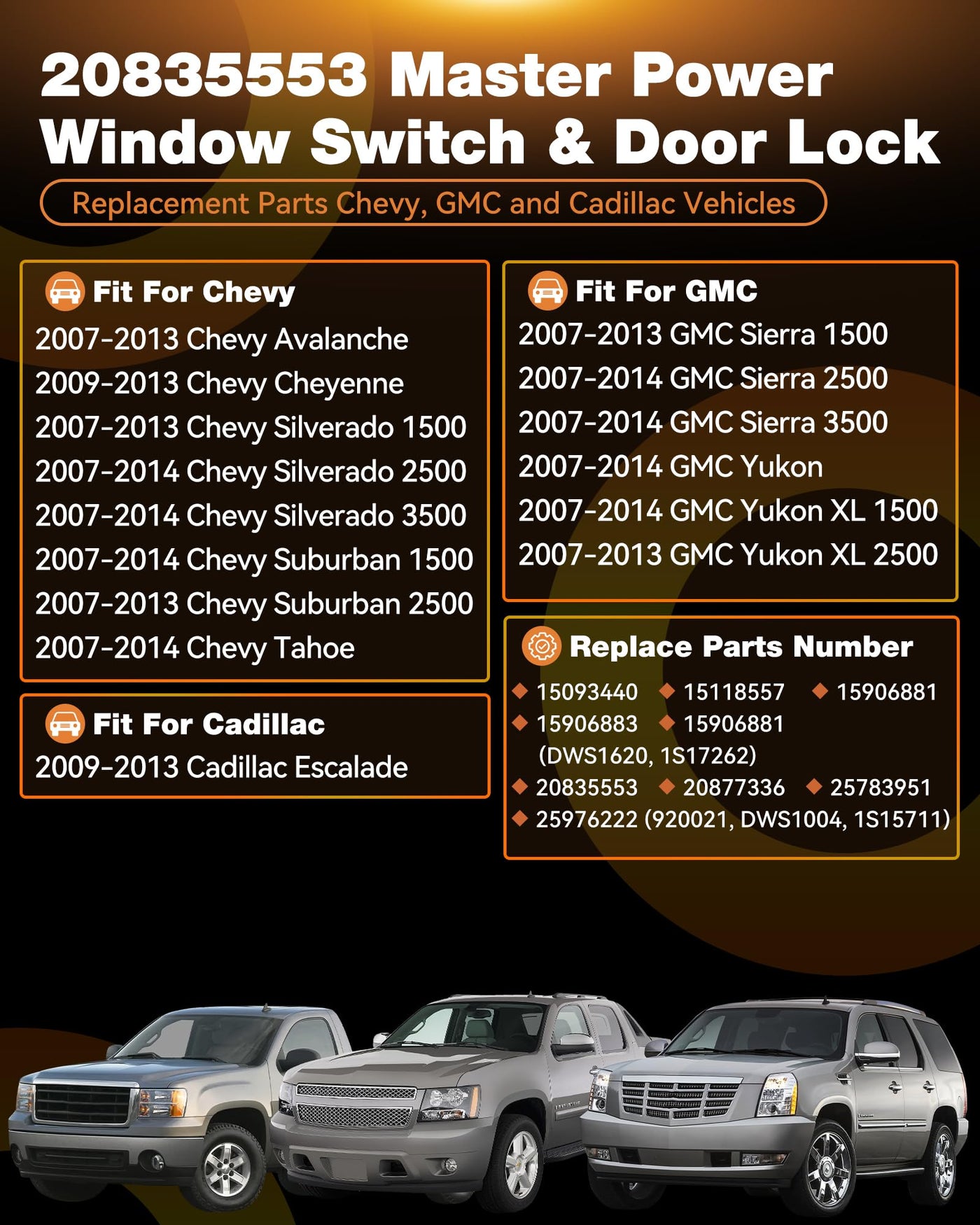 2007-2014 Chevy & GMC Power Window Switch Control Replacement Parts Number: 15093440, 15906881, 20835553, 20877336, 25783951, 25976222 920021, DWS1004, 1S15711 Fitments: For Chevy Avalanche 2007-2013 For Chevy Silverado 1500 2007-2013 For Chevy Silverado 2500 2007-2014 For Chevy Silverado 3500 2007-2014 For Chevy Suburban 1500 2007-2014 For Chevy Suburban 2500 2007-2013 For Chevy Tahoe 2007-2014 For GMC Sierra 1500 2007-2013 For GMC Sierra 2500 2007-2014 For GMC Sierra 3500 2007-2014 For GMC Yukon 2007-2008-2014 For GMC Yukon XL 1500 2007-2014 For GMC Yukon XL 2500 2007-2013 For Cadilla Escalade 2007-2008 Package Including: 1 x 20835553 Driver Side Master Window Switch