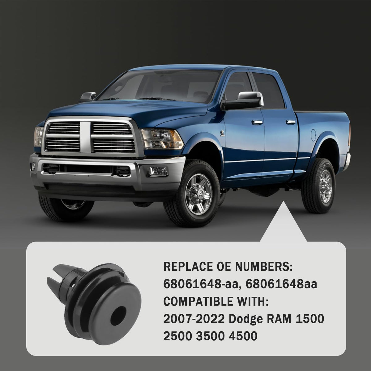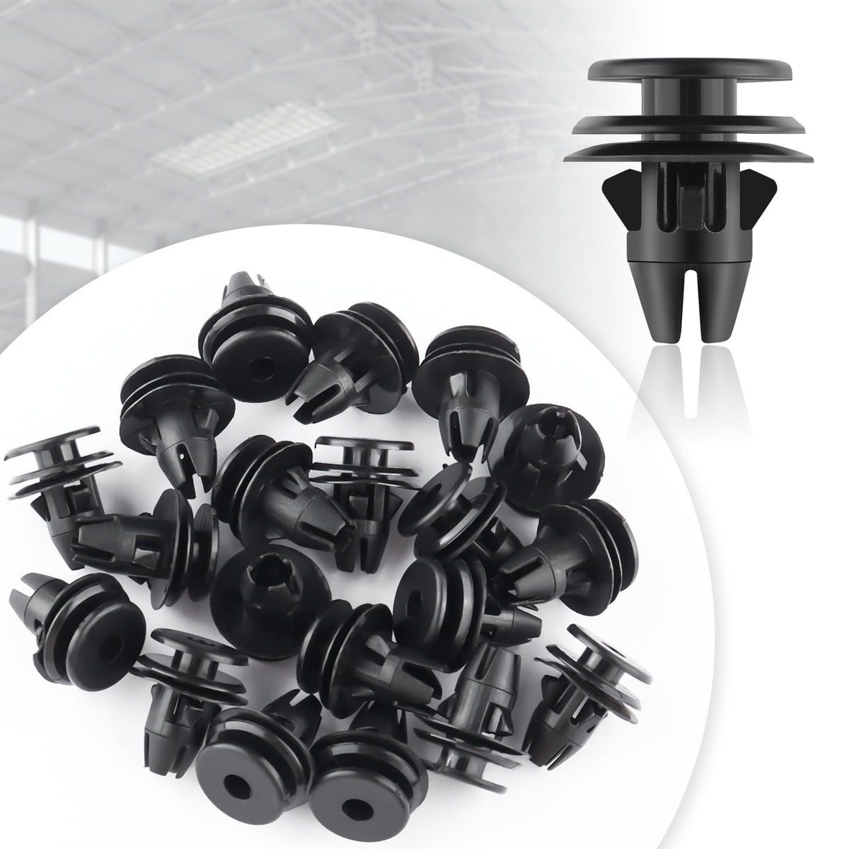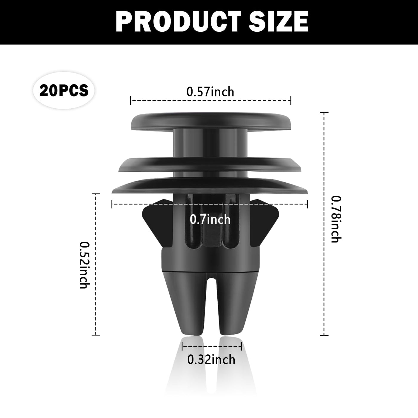 Quality Car Bumper Clips That Rival or Even Surpass The Originals!Automotive clips keep your car's fenders and splash guards attached and intact!Don't worry about damaging or losing car clips fasteners, we come with 20 of them, perfectly suited for your daily use!Automotive clips and fasteners are quick and easy to install and do a lot with a little money!A car bumper clips that solves all your problems for you!?? [Car Clips Rasteners Applications]? Replace part number:OEM#68061648aa? Product dimensions:Top diameter 0.57 inch, center diameter 0.7 inch, overall height 0.78 inch, rivet post opening diameter 0.32 inch? Before purchasing, please carefully confirm the size, model, and compatible model of the product? Compatible with Dodge 2007-2022 RAM 1500 2500 3500 4500?? [Car Clips Rasteners Attributes]? Colors:Black? Sizes:0.7 0.7 0.78 inch? Weight:0.75 oz? Material:Plastic? Packaging:20 Tail Light Retainers?? [Car Clips Rasteners Functions]? Feature:Durable, tough and long lasting? Function:Car push retainer clips fit for fender, bumper and engine cover
