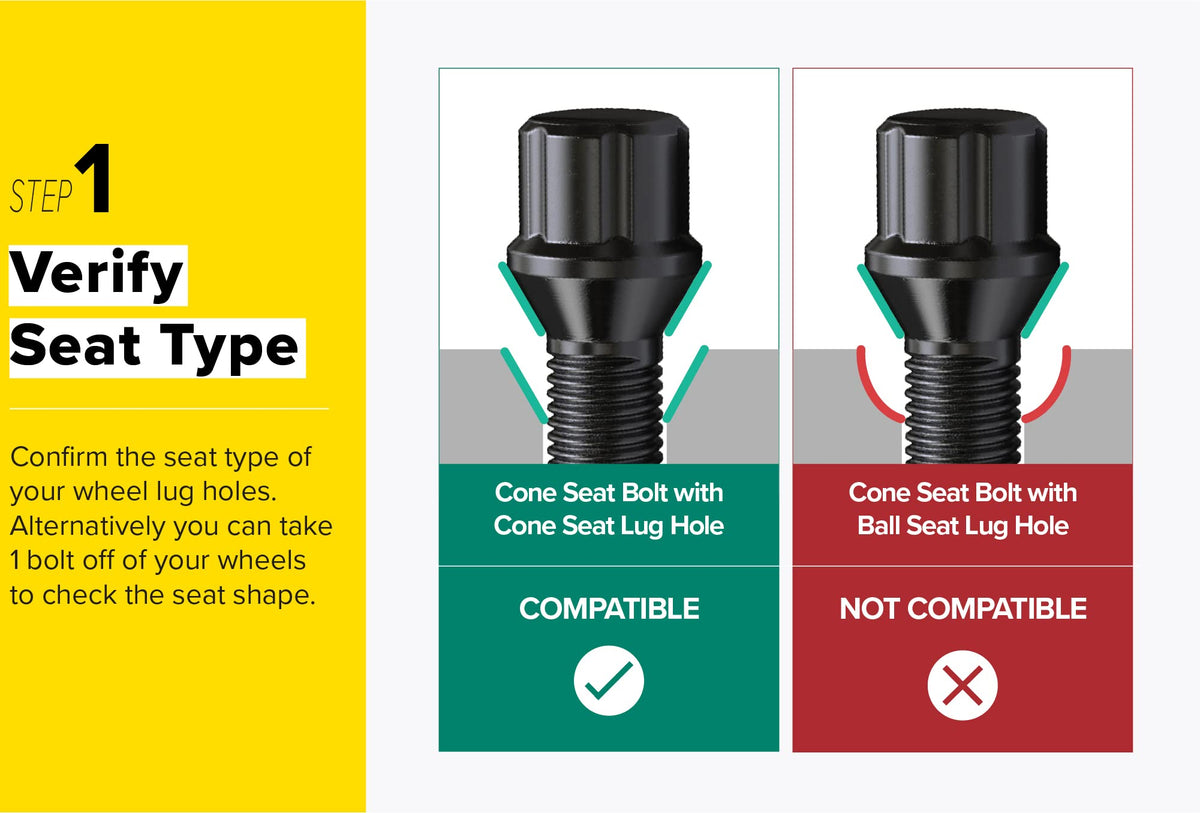 Q: What type of seat do these lug bolts require?A: These lug bolts require a Cone Seat (60 Degree Taper). Ensure your wheel lug holes have this specific seat type for proper installation.