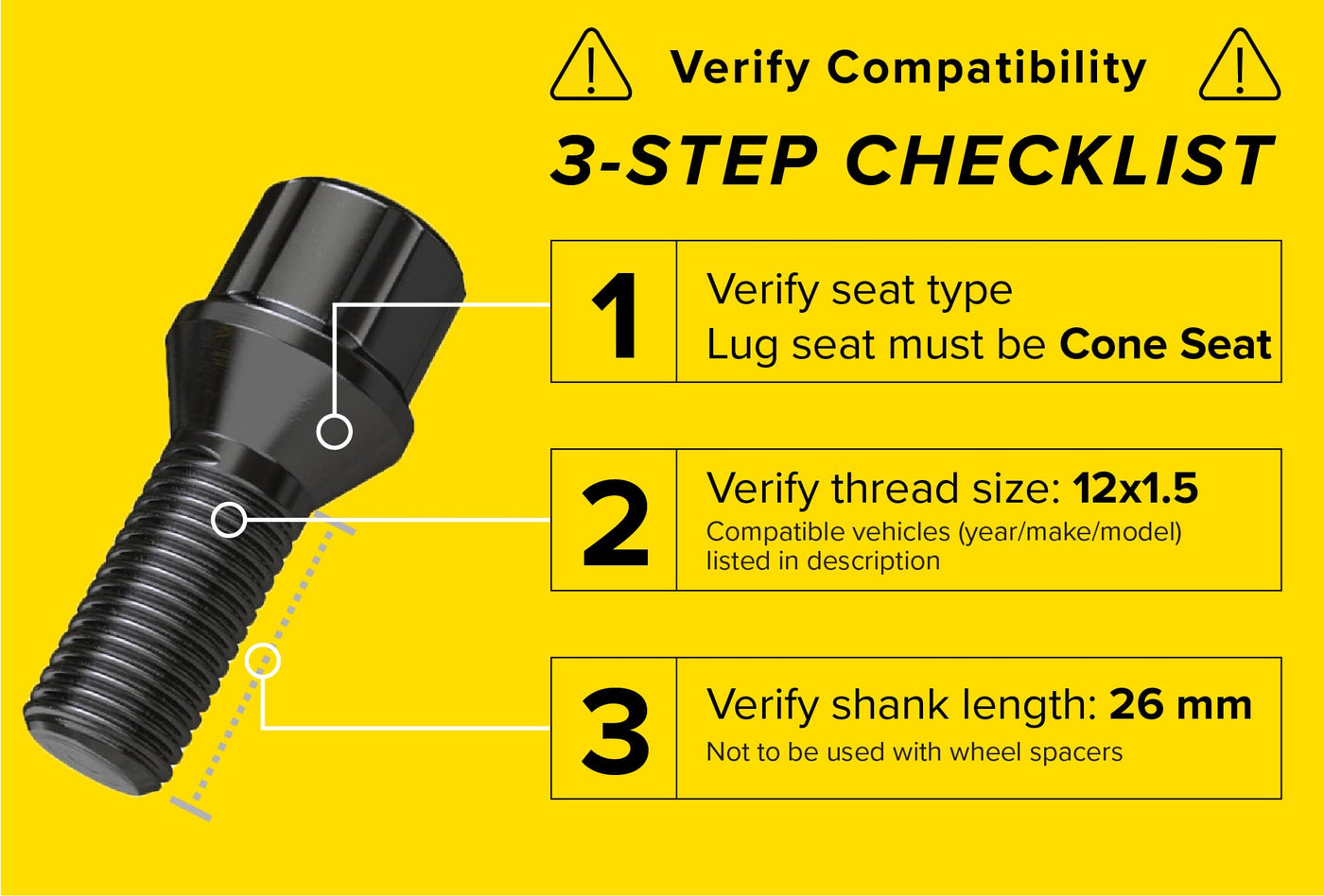[ Note ] These Are Oem Length Lug Bolts And Are Not Meant To Be Used With Wheel Spacers. [ Note ] Socket Key Has 23.5Mm Outer Diameter. Buyers Need To Check Their Wheel'S Lug Hole Size Is Large Enough. [ Specifications ] Thread Size: 12X1.5 Color: Black Seat Type: Cone Seat (60 Degree Taper) Shank Length: 26Mm [ Fitment ] Compatible With Bmw 3-Series E30 E36 E46 E90 E91 E92 E93 (Up To 2012) Compatible With Bmw 5-Series E28 E34 E39 E60 E61 (Up To 2010) Compatible With Bmw 6-Series E24 E63 E64 (Up To 2003) Compatible With Bmw 7-Series E23 E32 E38 (Up To 2001) Compatible With Bmw 2000-2009 Z3 & Z4 (E52 E85 E89) [ Note ] Buyers Responsible For Confirming Vehicle Has 12X1.5 Bolts [ How To Determine What Shank Length Is Needed } 1) Measure Shank Length Of Oem Bolt (Threaded Portion, Starting At End Of The Seat To The End Of The Bolt). 2) If Your Shank Length Is 26Mm, These Lug Bolts Can Work For Your Application. [ Important: Check Before Purchasing ] - Vehicle Must Use 12X1.5 Threaded Lug Bolts. - Shank Length: Verify This 26Mm Shank Length Bolt Is The Correct Size. Buyers Must Measure Their Oem Bolt And Spacer To Determine If This Is The Correct Length. - Seat Type: Check Your Wheel Lug Hole. These Bolts Will Only Work If Your Lug Holes Are Cone Seat (60 Degree Taper). - [ Note ] Wheel Lug Hole Diameter: The Included Socket Has A 23.5Mm Diameter. Your Lug Holes Must Be Larger Than This.