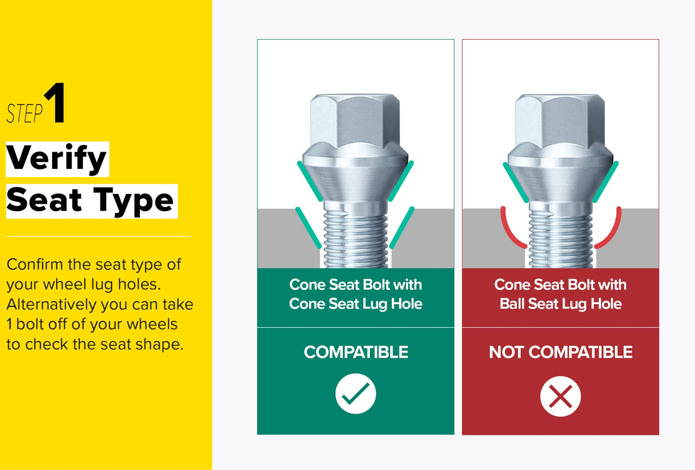 Q: What type of seat do these lug bolts have?A: These lug bolts feature a Cone Seat (60 Degree Taper), which is the most common type for compatible vehicles. Make sure your wheel lug holes accommodate this type before purchasing.