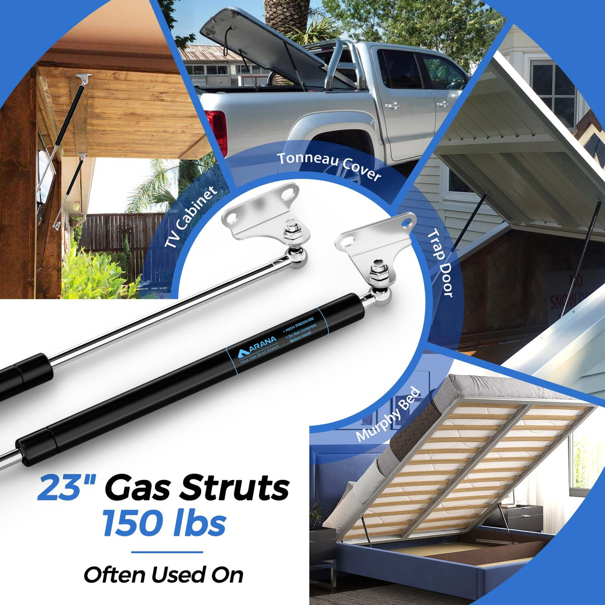 Q: What is the extended and compressed length of these gas struts?A: The extended length of the ARANA 23 inch gas struts is 22.7 inches (576 mm), while the compressed length is 13.6 inches (345 mm). This makes them suitable for a wide range of applications requiring lift support.