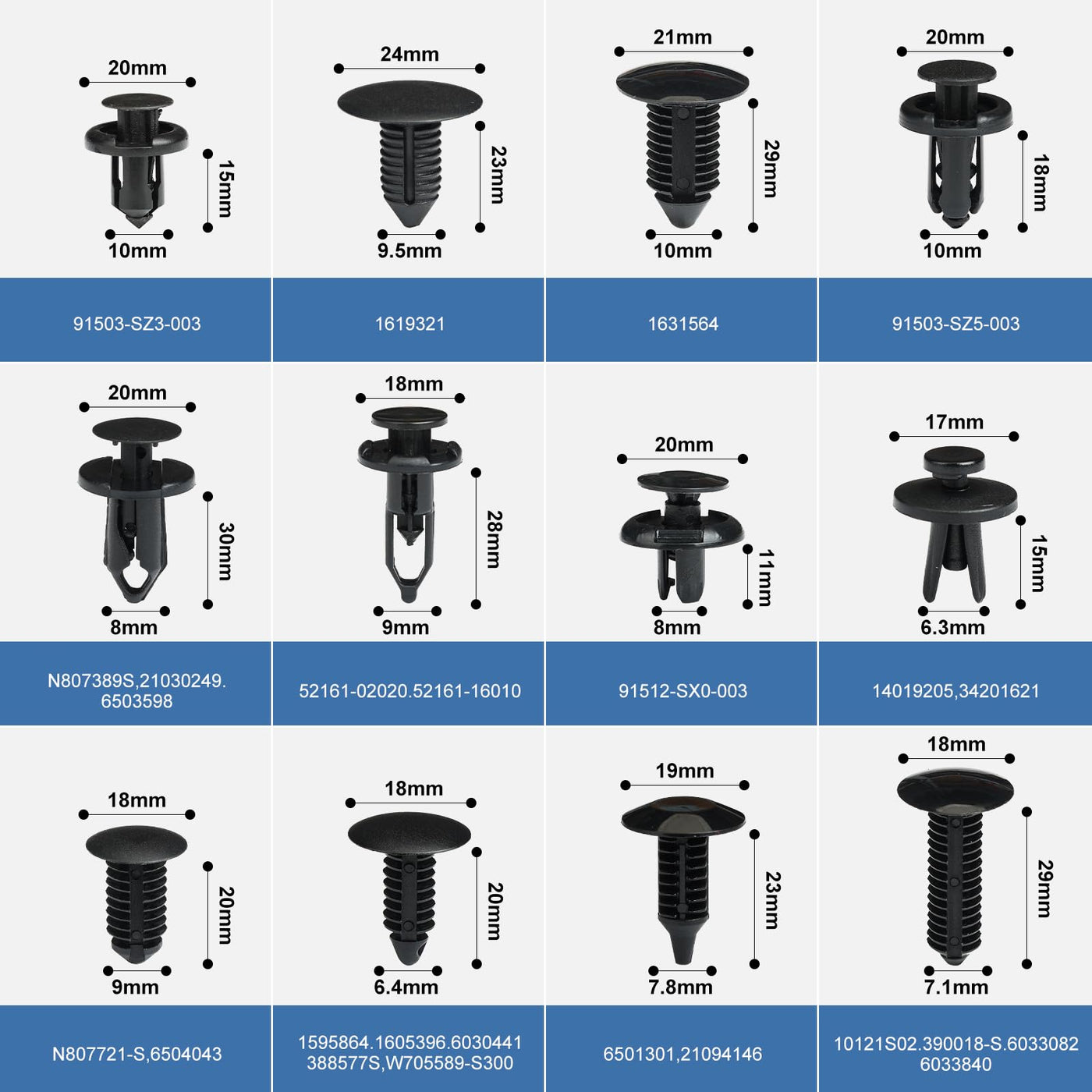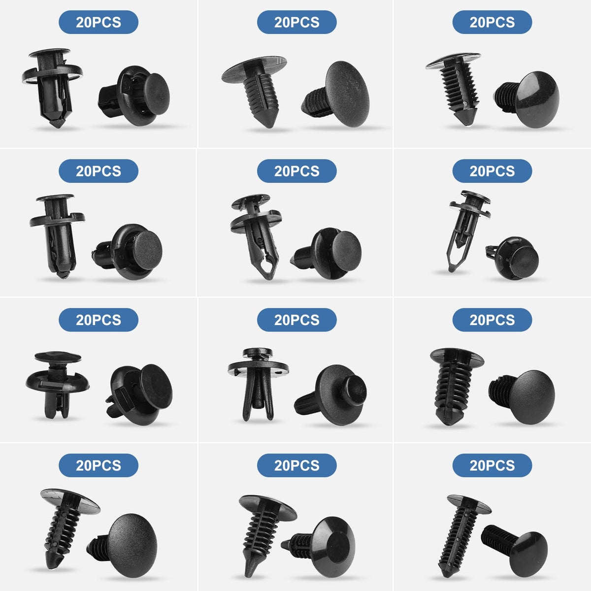 Q: What sizes of clips are included in the 240 Pcs Bumper Clips set?A: The set includes 12 of the most popular sizes, accommodating hole sizes ranging from 6.3mm to 10mm, perfect for various automotive applications.