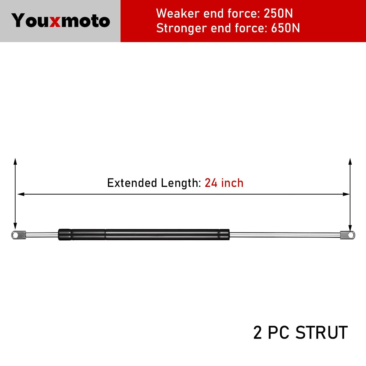 Force Of The Weaker End : 250N Force Of The Stronger End :675N Extended Length : 24In Product Usage Scenarios Fit For : The Best Design For Murphy Bed, Canibet Door, Floor Hatch, Heavy Duty Toolbox, Window, And So On. Package : 2 24 Inch Gas Struts 4 Ball Stud 4 Eyelet End 4 Ball Socket End
